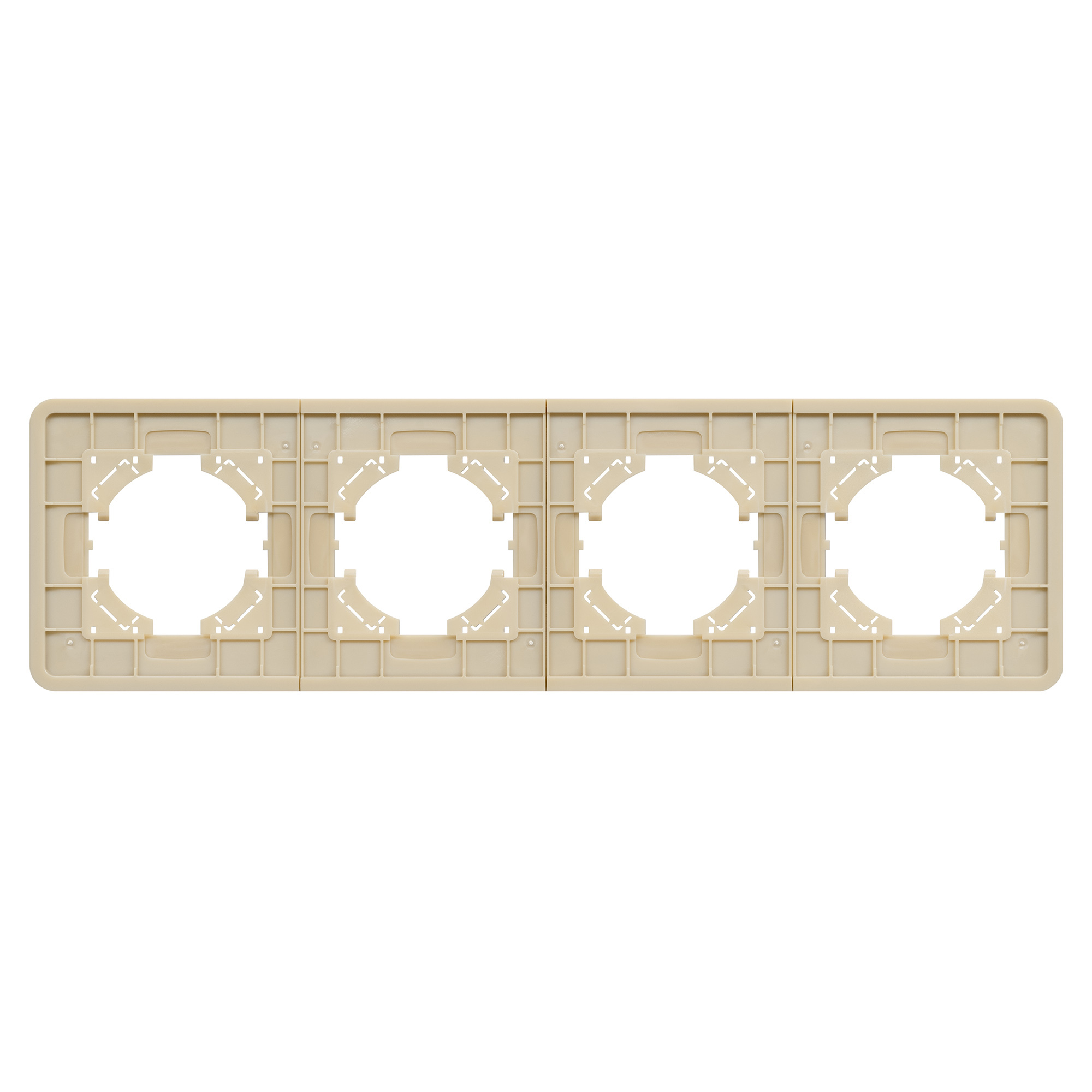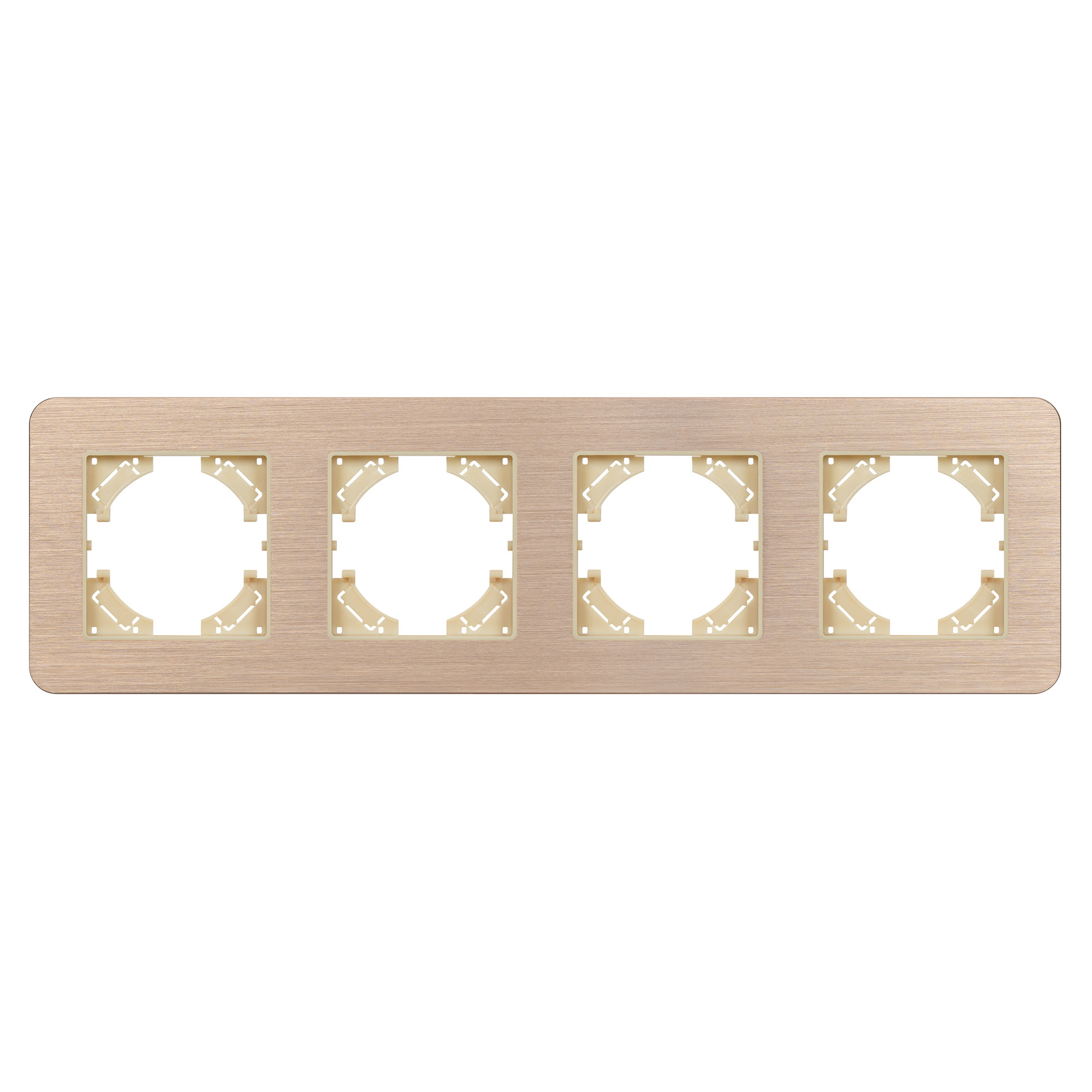 Рамка алюминиевая на 4 поста, под встраиваемый механизм. Цвет - золотой. Среднего уровня герметичности IP20. Ориентация монтажа - горизонтальная (основным ориентиром служат посадочные выступы для накладки механизма). Габаритные размеры: длина 299 мм, ширина 86 мм, высота 7 мм. Гарантийный срок 12 мес.
