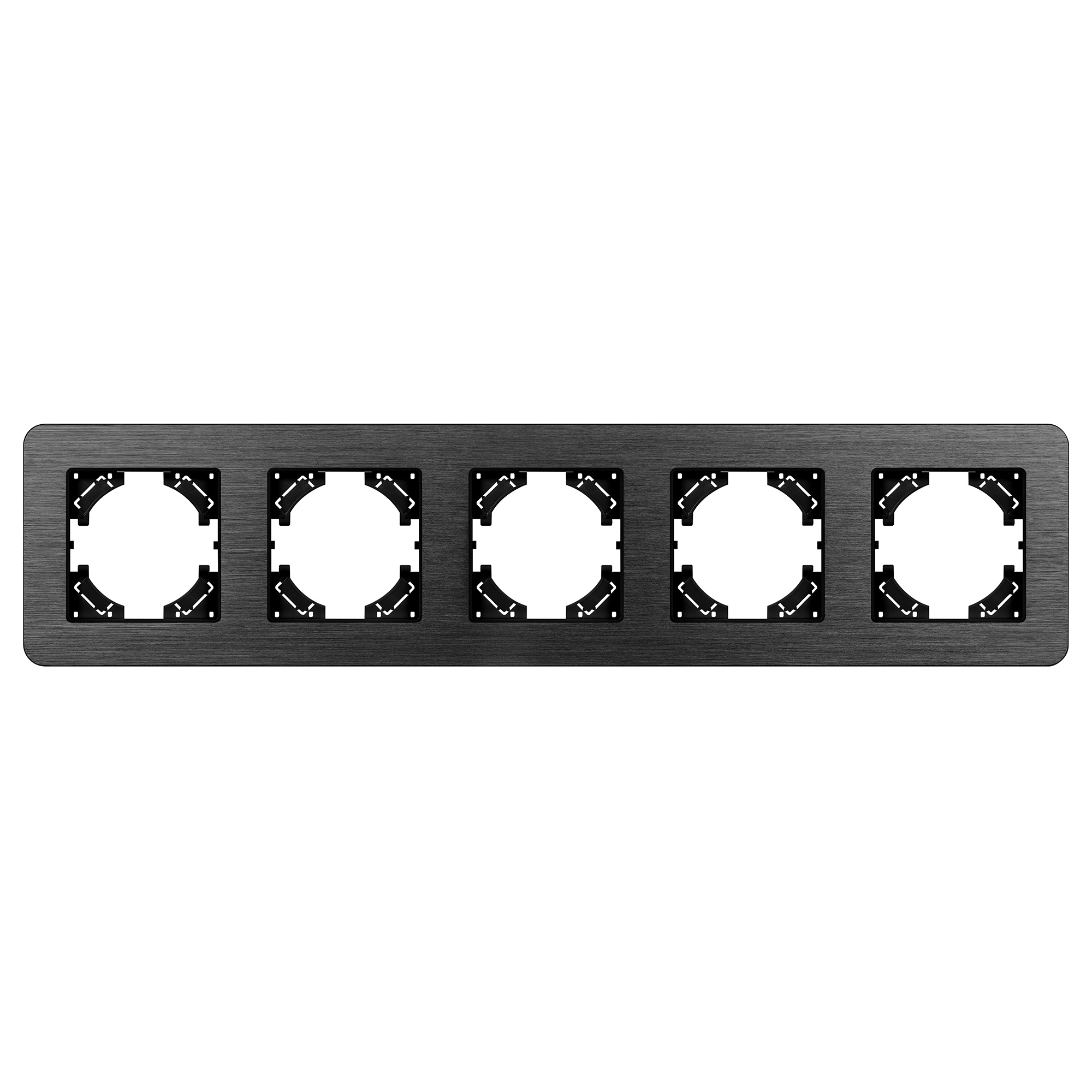 Рамка алюминиевая на 5 постов, под встраиваемый механизм. Цвет - черный. Среднего уровня герметичности IP20. Ориентация монтажа - горизонтальная (основным ориентиром служат посадочные выступы для накладки механизма). Габаритные размеры: длина 370 мм, ширина 86 мм, высота 7 мм. Гарантийный срок 12 мес.
