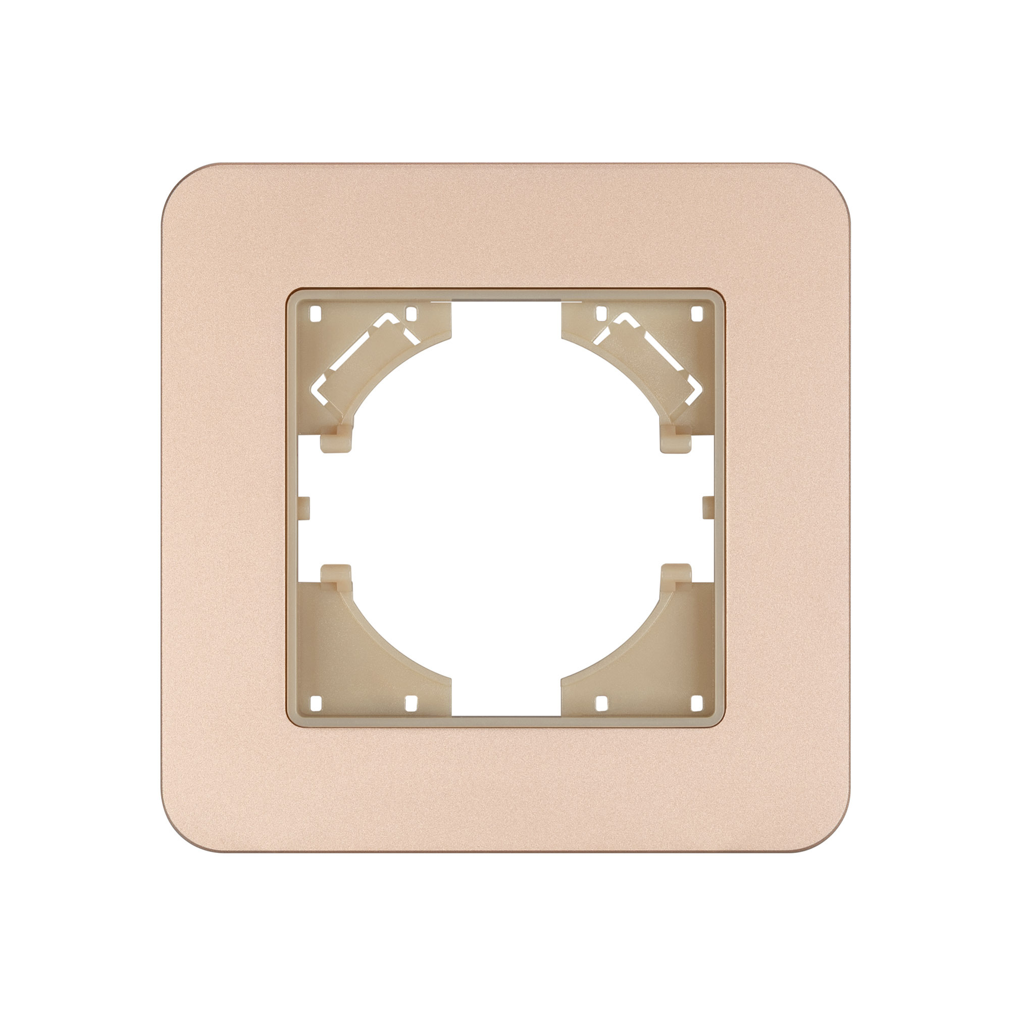 Рамка алюминиевая на 1 пост, под встраиваемый механизм. Цвет - золотой с Soft-Touch покрытием. Среднего уровня герметичности IP20. Ориентация монтажа - горизонтальная (основным ориентиром служат посадочные выступы для накладки механизма). Габаритные размеры: длина 86 мм, ширина 86 мм, высота 7 мм. Гарантийный срок 12 мес.