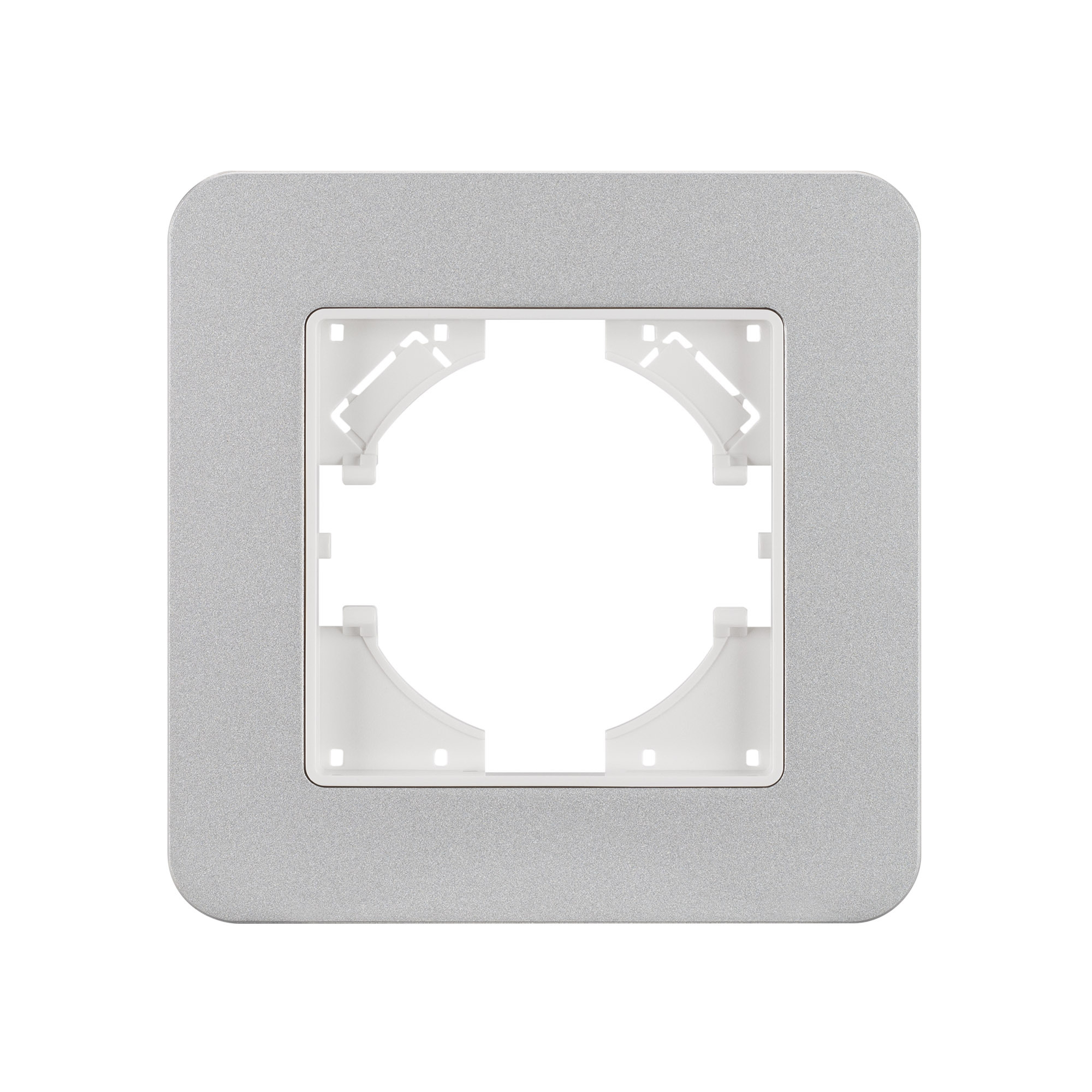 Рамка алюминиевая на 1 пост, под встраиваемый механизм. Цвет - серебристый с Soft-Touch покрытием. Среднего уровня герметичности IP20. Ориентация монтажа - горизонтальная (основным ориентиром служат посадочные выступы для накладки механизма). Габаритные размеры: длина 86 мм, ширина 86 мм, высота 7 мм. Гарантийный срок 12 мес.