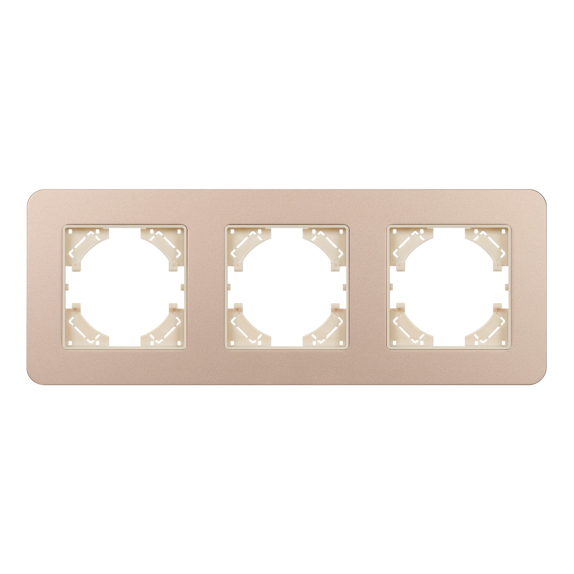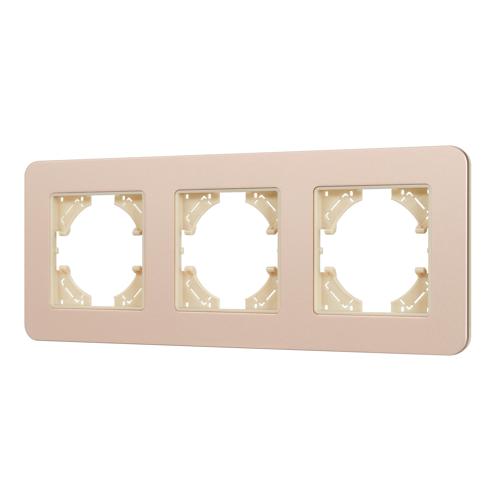 Рамка алюминиевая на 3 поста, под встраиваемый механизм. Цвет - золотой с Soft-Touch покрытием. Среднего уровня герметичности IP20. Ориентация монтажа - горизонтальная (основным ориентиром служат посадочные выступы для накладки механизма). Габаритные размеры: длина 228 мм, ширина 86 мм, высота 7 мм. Гарантийный срок 12 мес.