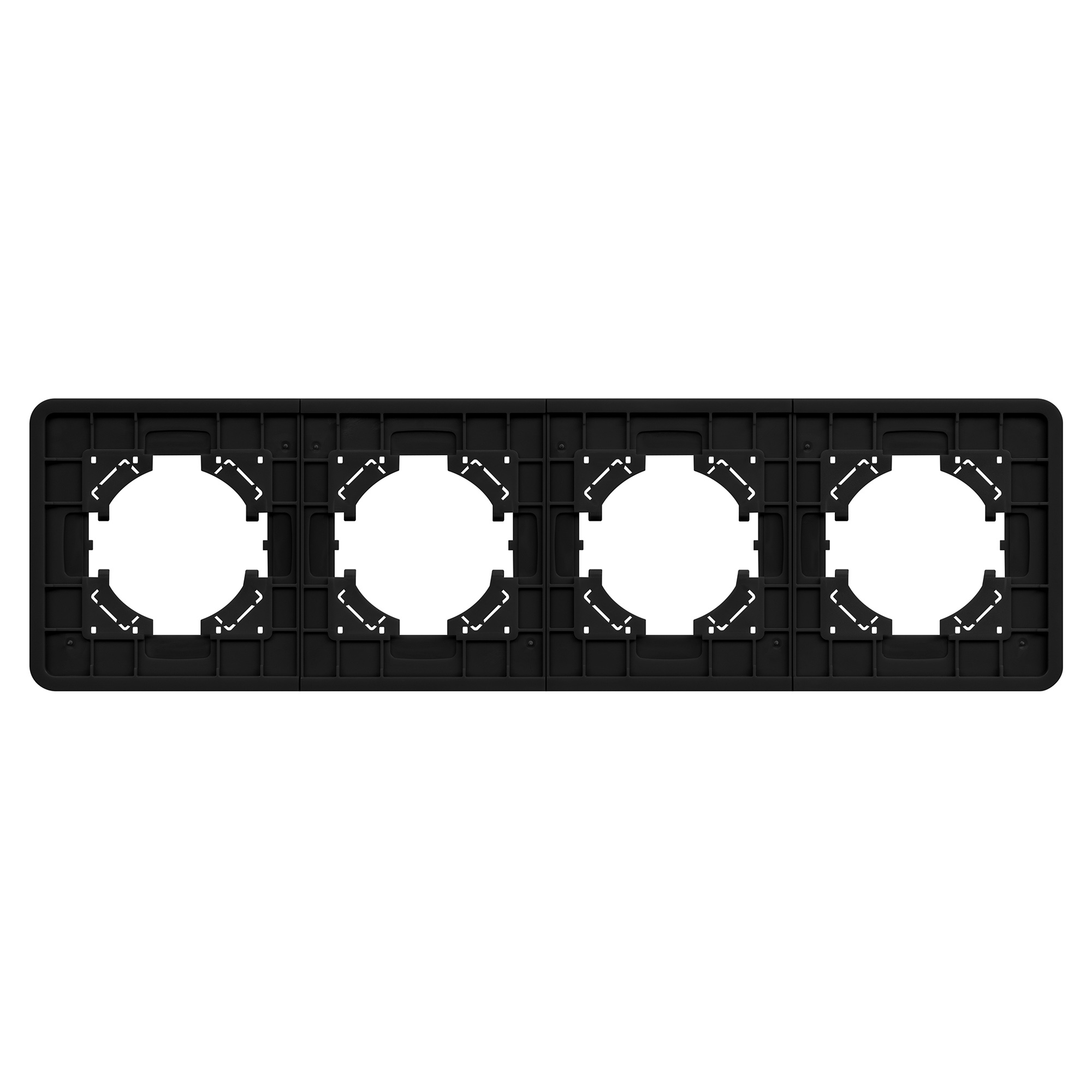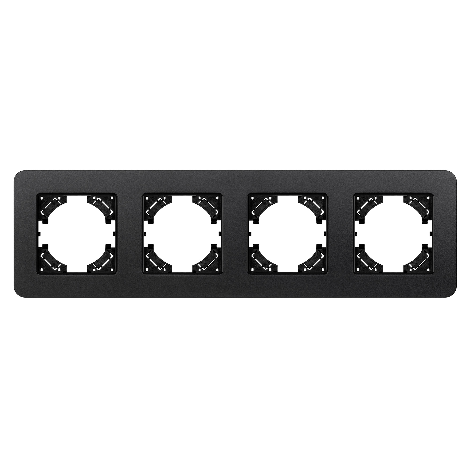 Рамка алюминиевая на 4 поста, под встраиваемый механизм. Цвет - черный с Soft-Touch покрытием. Среднего уровня герметичности IP20. Ориентация монтажа - горизонтальная (основным ориентиром служат посадочные выступы для накладки механизма). Габаритные размеры: длина 299 мм, ширина 86 мм, высота 7 мм. Гарантийный срок 12 мес.