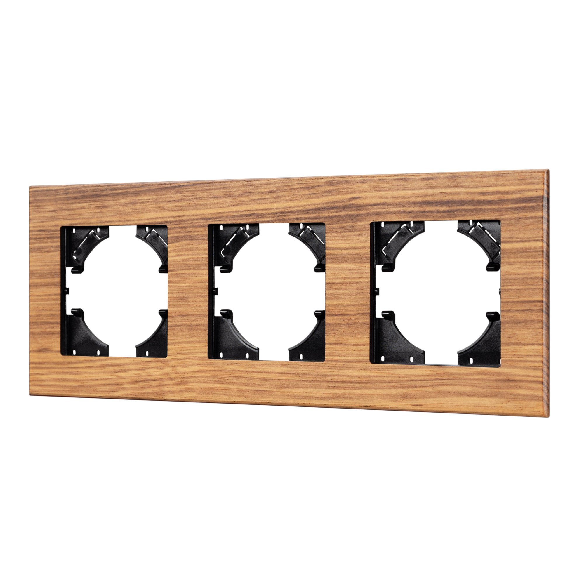 Рамка пластиковая на 3 поста, под встраиваемый механизм, с накладкой из натурального дерева. Цвет накладки - натуральное дерево* (осветленный), цвет рамки - черный. Среднего уровня герметичности IP20. Ориентация монтажа - горизонтальная (основным ориентиром служат посадочные выступы для накладки механизма). Габаритные размеры: длина 228 мм, ширина 86 мм, высота 7 мм. Гарантийный срок 12 мес. *Цвет и рисунок структуры дерева уникальный для каждой рамки. Допустимы отличия от представленного изображения.