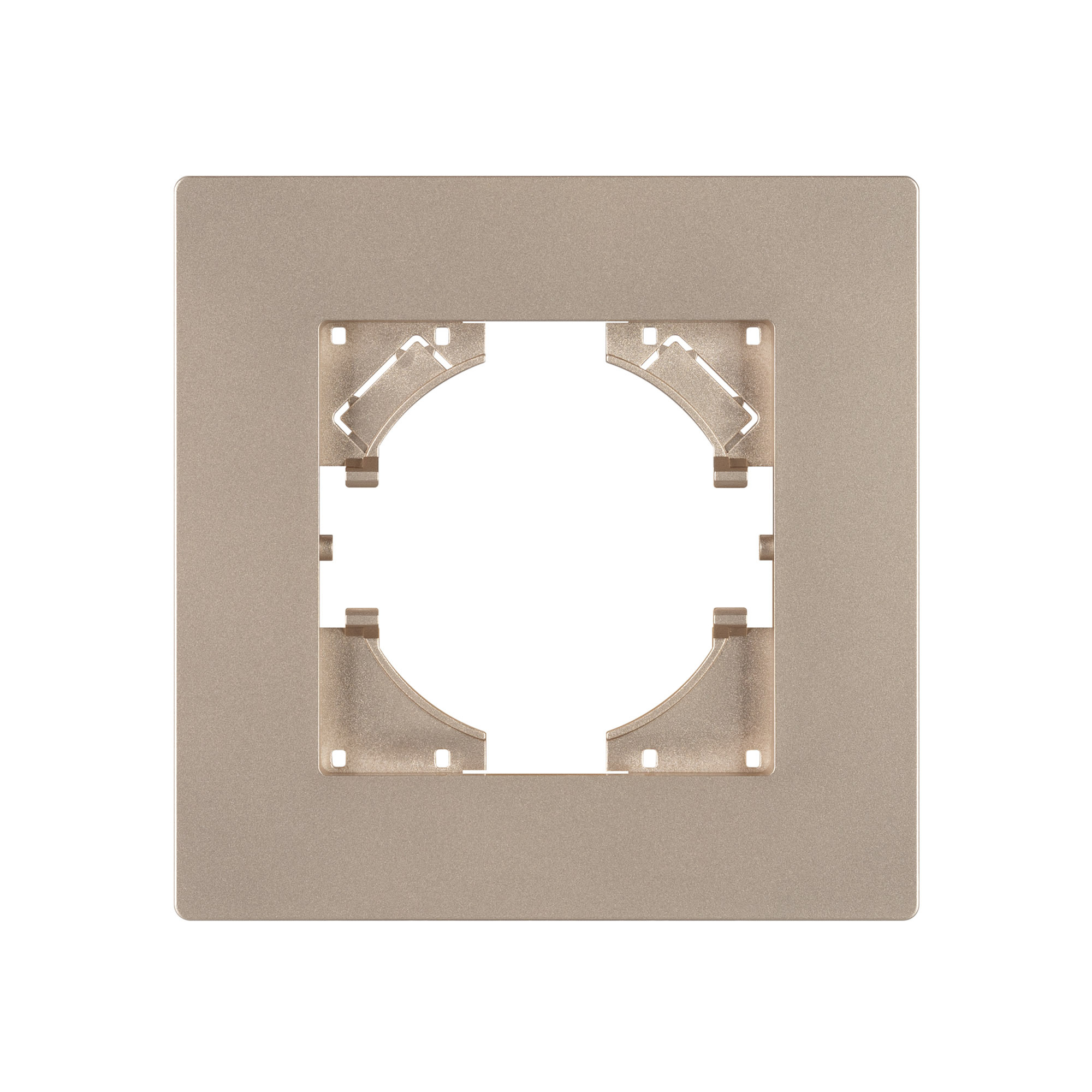 Рамка пластиковая на 1 пост, под встраиваемый механизм. Цвет - золотой. Среднего уровня герметичности IP20. Ориентация монтажа - горизонтальная (основным ориентиром служат посадочные выступы для накладки механизма). Габаритные размеры: длина 86 мм, ширина 86 мм, высота 7 мм. Гарантийный срок 12 мес.