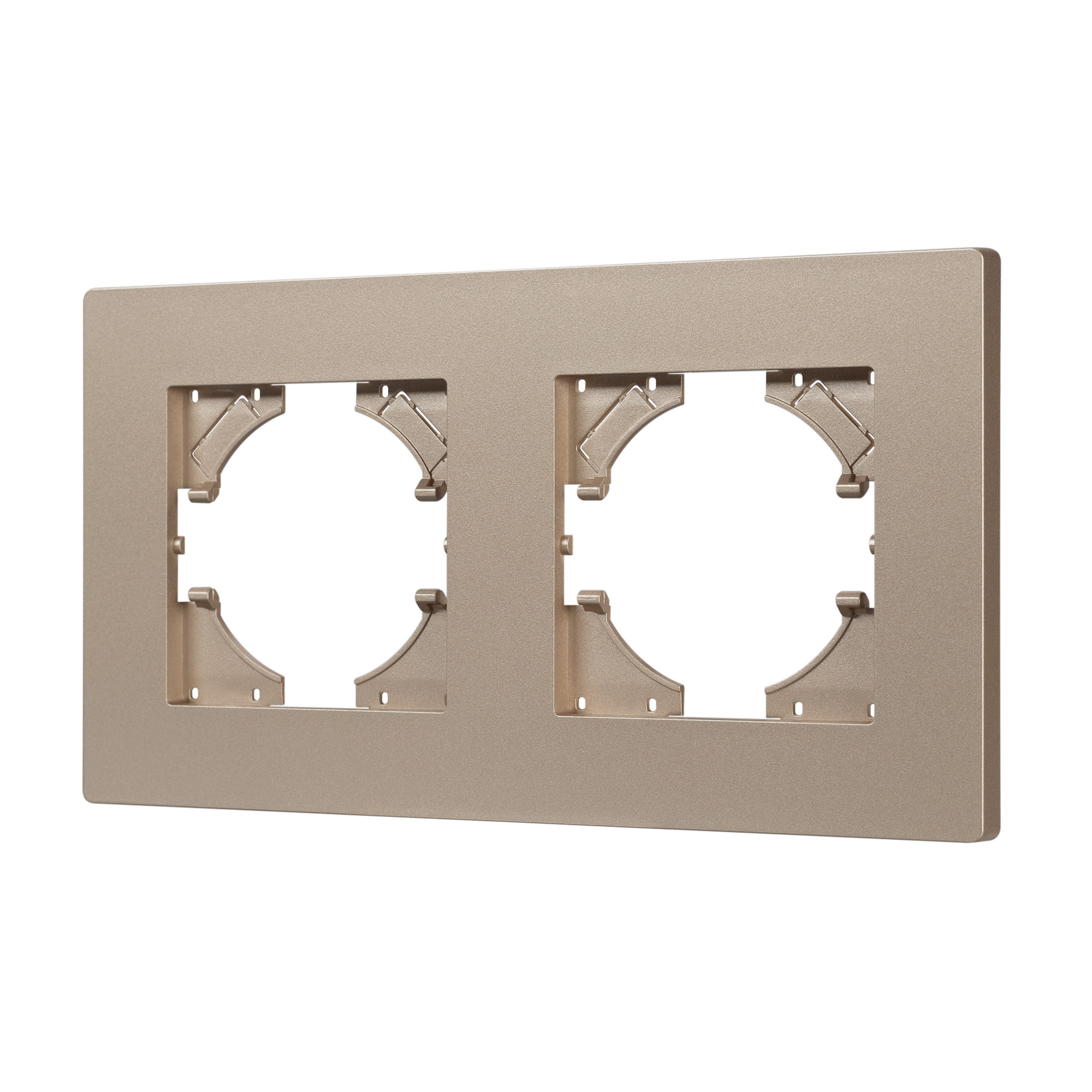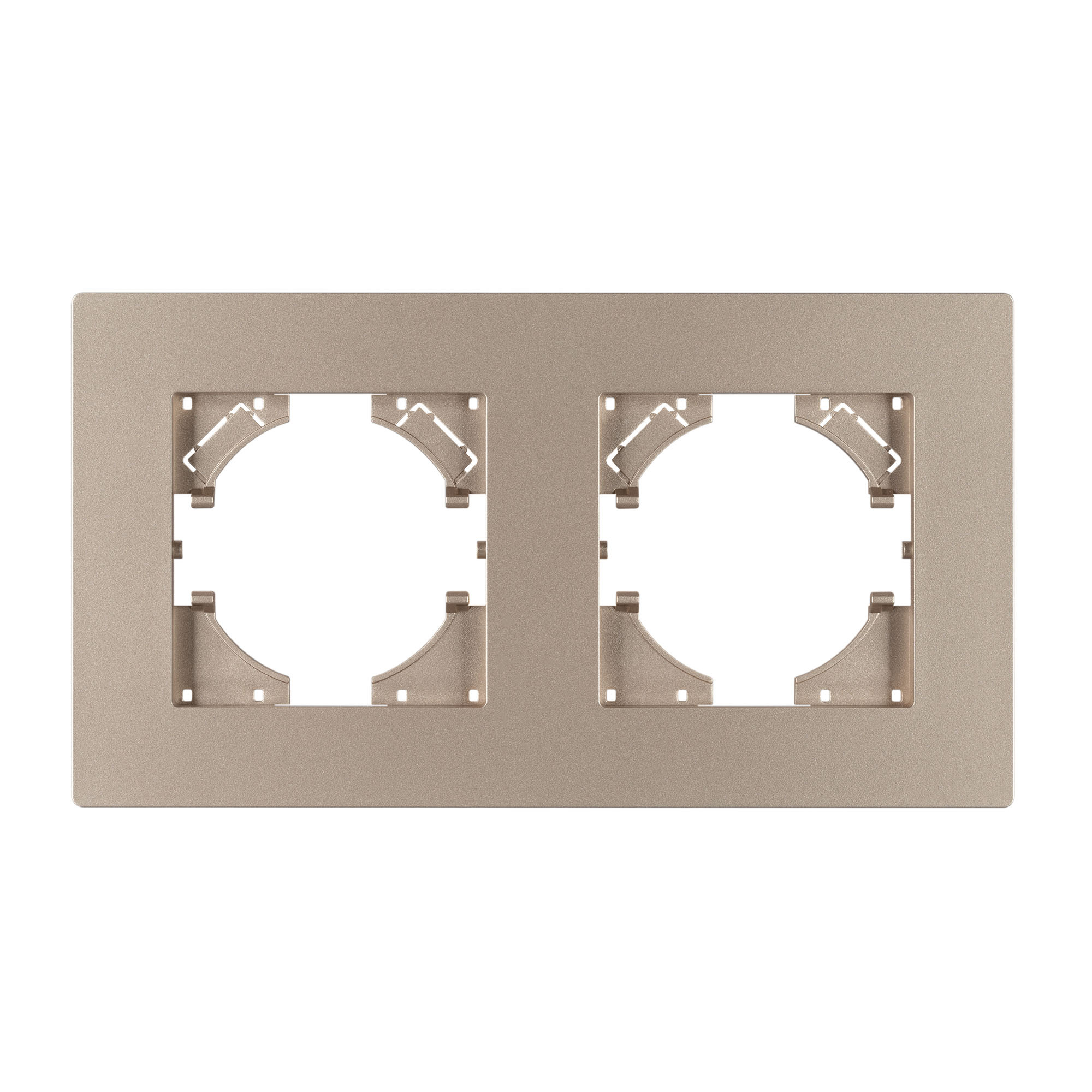Рамка пластиковая на 2 поста, под встраиваемый механизм. Цвет - золотой. Среднего уровня герметичности IP20. Ориентация монтажа - горизонтальная (основным ориентиром служат посадочные выступы для накладки механизма). Габаритные размеры: длина 157 мм, ширина 86 мм, высота 7 мм. Гарантийный срок 12 мес.
