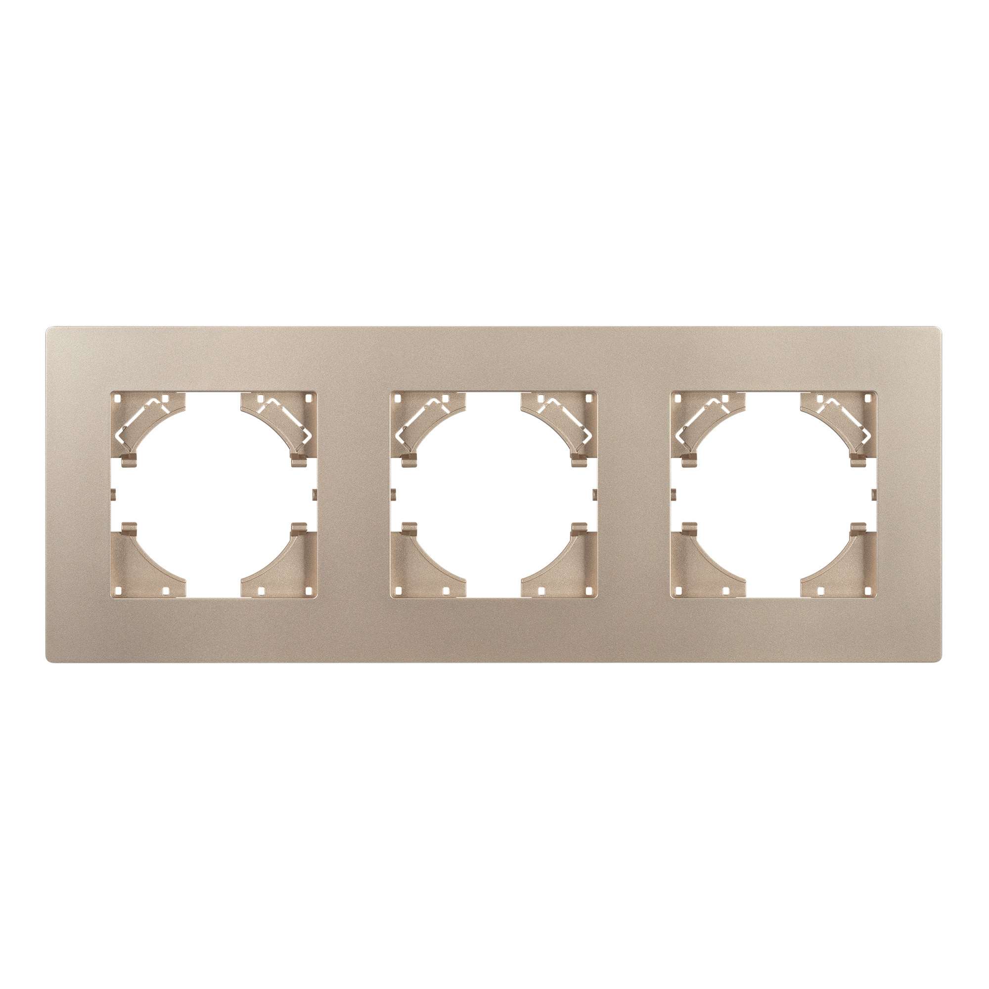 Рамка пластиковая на 3 поста, под встраиваемый механизм. Цвет - золотой. Среднего уровня герметичности IP20. Ориентация монтажа - горизонтальная (основным ориентиром служат посадочные выступы для накладки механизма). Габаритные размеры: длина 228 мм, ширина 86 мм, высота 7 мм. Гарантийный срок 12 мес.