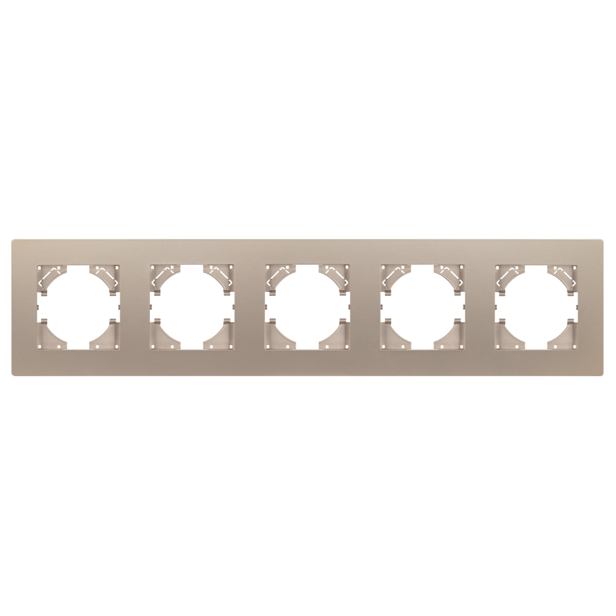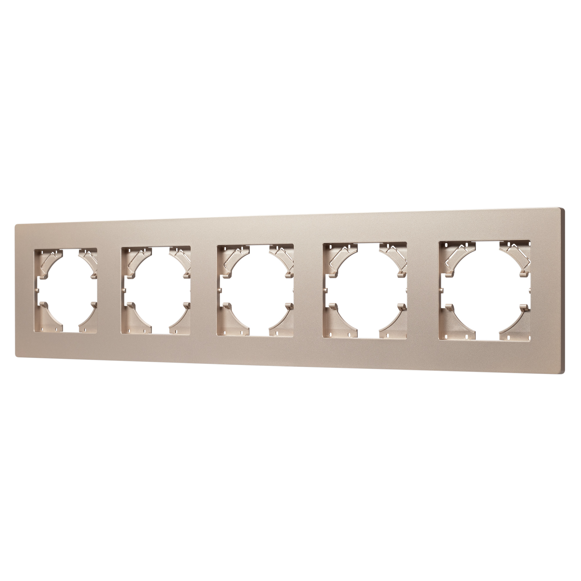 Рамка пластиковая на 5 постов, под встраиваемый механизм. Цвет - золотой. Среднего уровня герметичности IP20. Ориентация монтажа - горизонтальная (основным ориентиром служат посадочные выступы для накладки механизма). Габаритные размеры: длина 370 мм, ширина 86 мм, высота 7 мм. Гарантийный срок 12 мес.