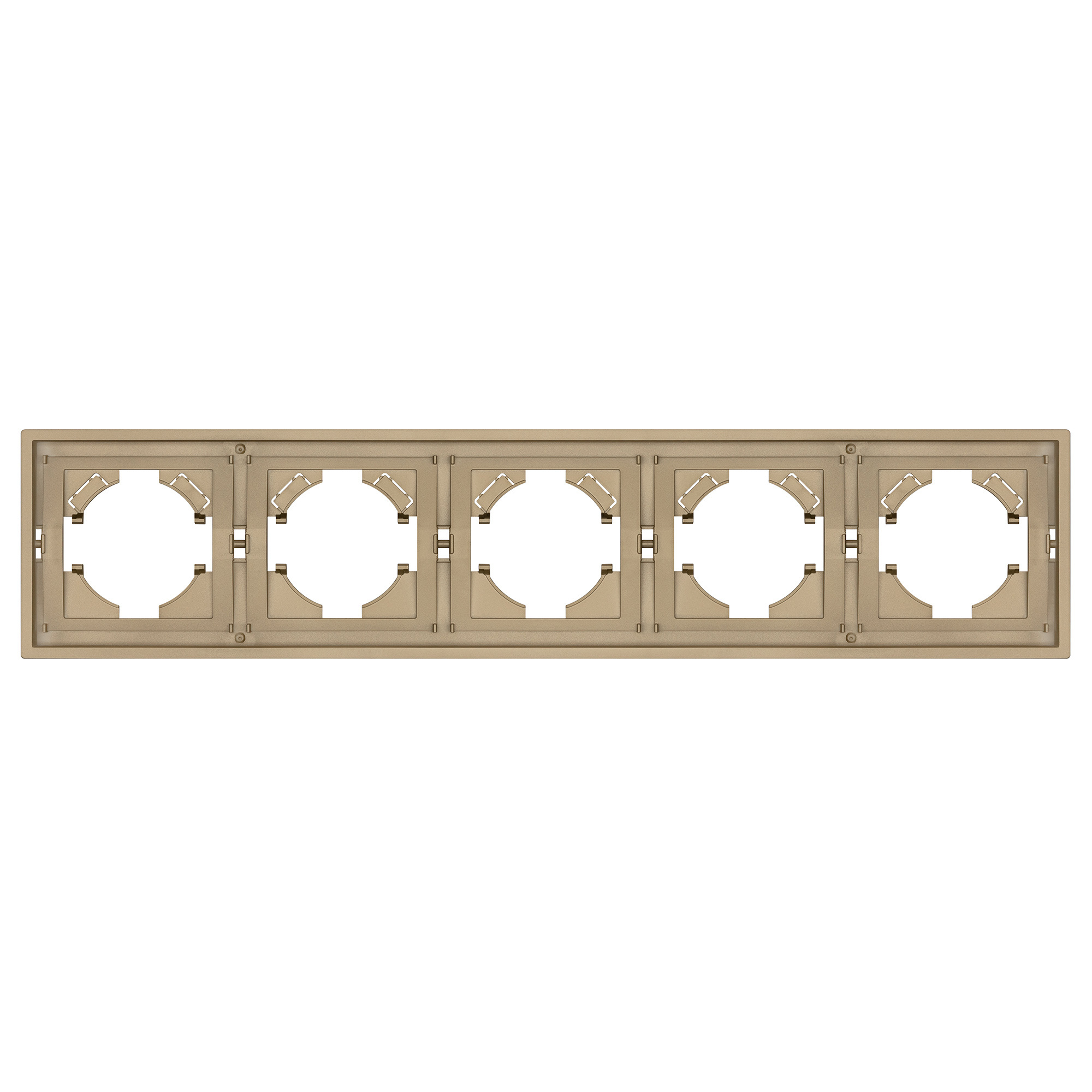 Рамка пластиковая на 5 постов, под встраиваемый механизм. Цвет - золотой, с Soft-Touch покрытием. Среднего уровня герметичности IP20. Ориентация монтажа горизонтальная. Габаритные размеры: длина 364 мм, ширина 80 мм, высота 9 мм. Гарантийный срок 12 мес.