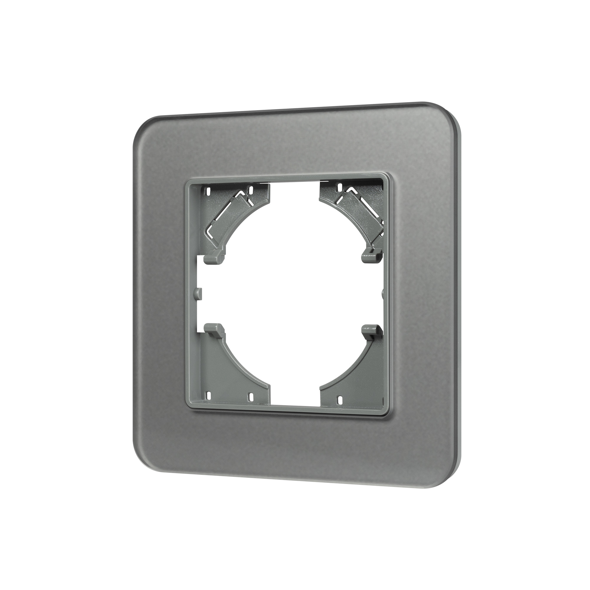 Рамка стеклянная на 1 пост, под встраиваемый механизм. Цвет - серый с Soft-Touch покрытием. Среднего уровня герметичности IP20. Ориентация монтажа - горизонтальная (основным ориентиром служат посадочные выступы для накладки механизма). Габаритные размеры: длина 86 мм, ширина 86 мм, высота 7 мм. Гарантийный срок 12 мес.
