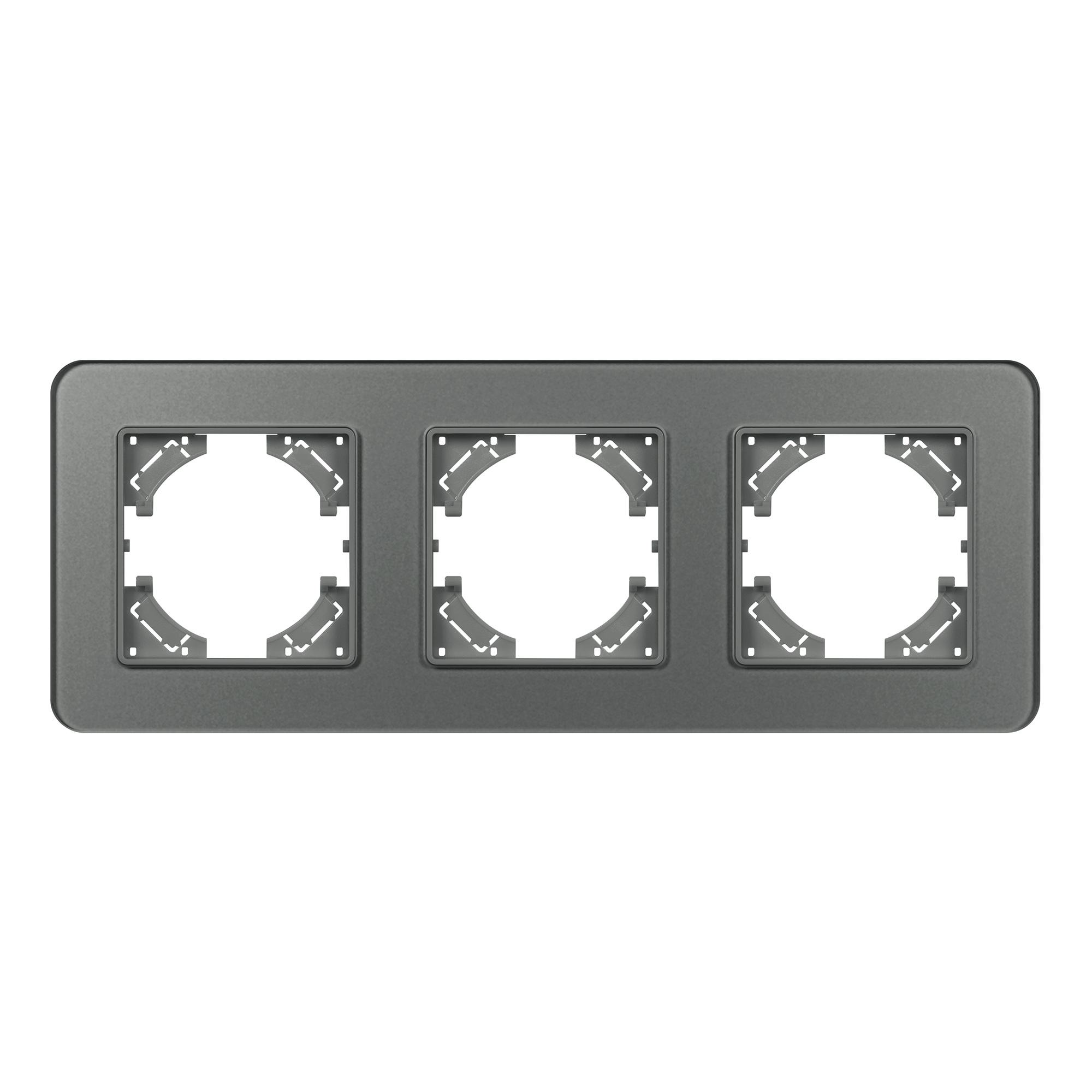 Рамка стеклянная на 3 поста, под встраиваемый механизм. Цвет - серый с Soft-Touch покрытием. Среднего уровня герметичности IP20. Ориентация монтажа - горизонтальная (основным ориентиром служат посадочные выступы для накладки механизма). Габаритные размеры: длина 228 мм, ширина 86 мм, высота 7 мм. Гарантийный срок 12 мес.
