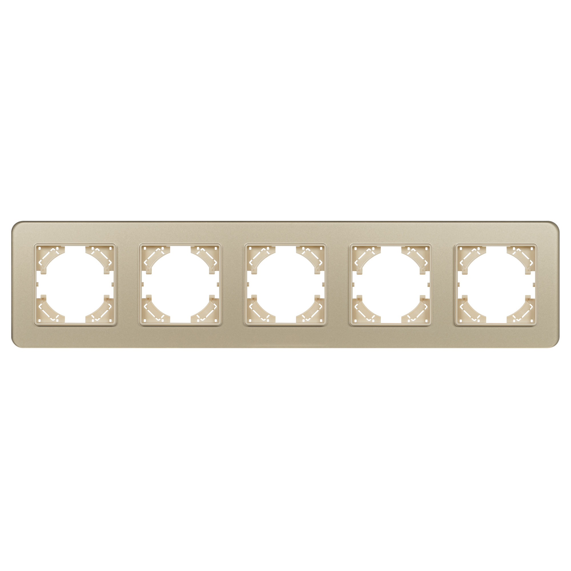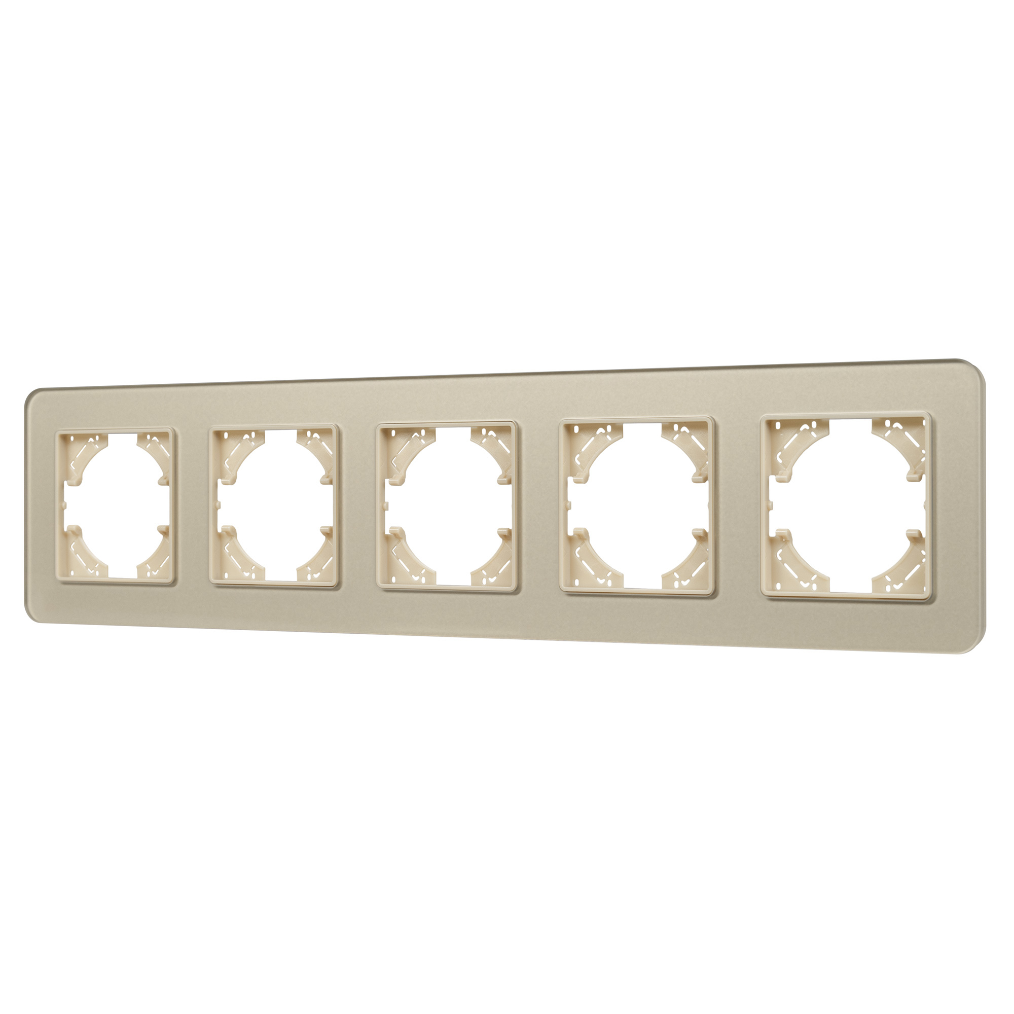 Рамка стеклянная на 5 постов, под встраиваемый механизм. Цвет - золотой с Soft-Touch покрытием. Среднего уровня герметичности IP20. Ориентация монтажа - горизонтальная (основным ориентиром служат посадочные выступы для накладки механизма). Габаритные размеры: длина 370 мм, ширина 86 мм, высота 7 мм. Гарантийный срок 12 мес.