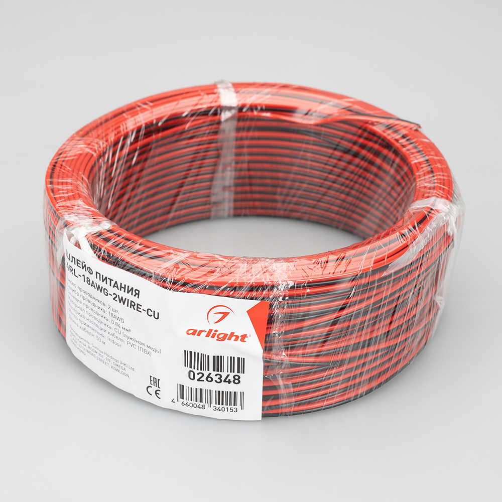 Шлейф для питания и управления одноцветными светодиодными лентами. 2 проводника, калибр проводника 18AWG, сечение проводника 0.84 мм², проводник из луженой меди, внешняя оболочка из ПВХ красного и чёрного цветов. Длина кабеля в бухте — 50 метров. (!!!)Калибр проводника шлейфа питания и его сечение должны соответствовать нагрузке, смотрите инструкцию.