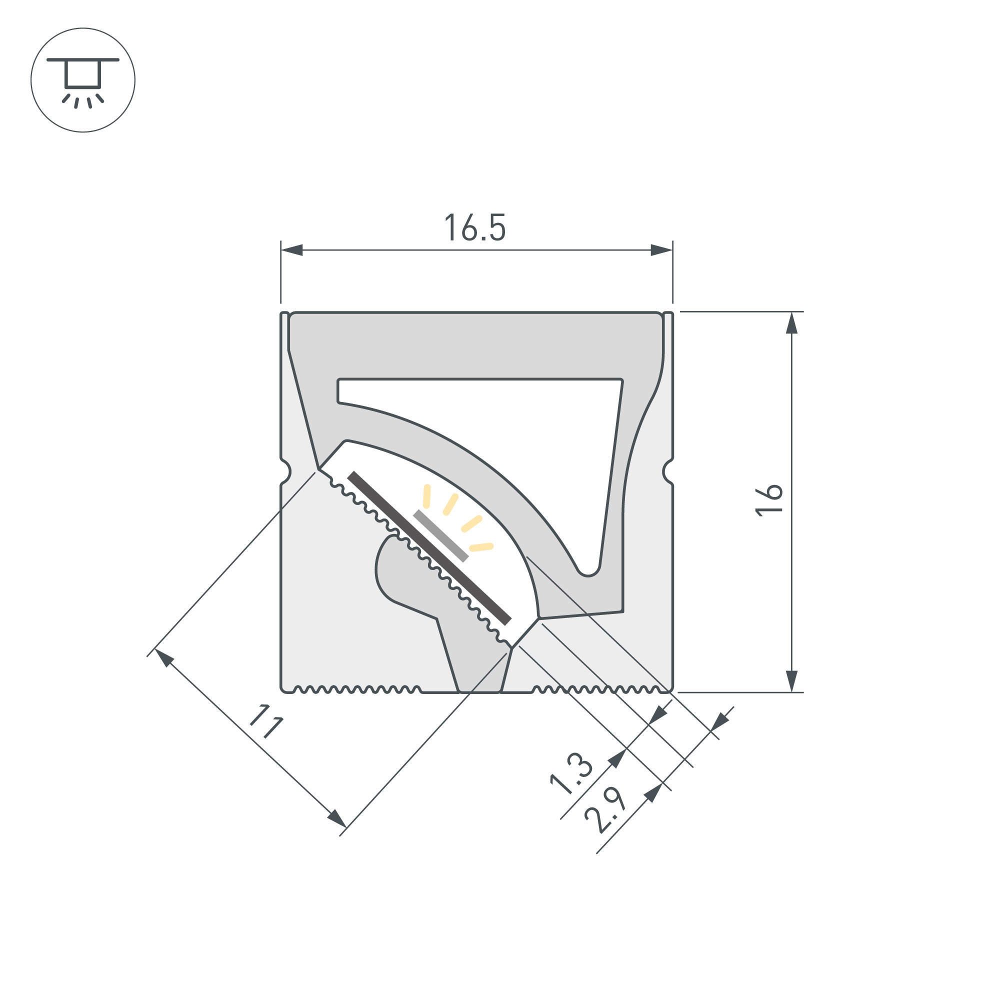 Цельнолитой силиконовый гибкий профиль, белый матовый. Габаритные размеры 20000×16×16 мм. Вертикальный изгиб TOP, минимальный радиус изгиба 50 мм. Горизонтальный изгиб SIDE, минимальный радиус изгиба 200 мм. Для установки во влажных помещениях необходима герметизация при помощи двухкомпонентного эпоксидного герметика. Класс пылевлагозащиты – IP65 (при соблюдении технологии герметизации). Для лент шириной 10 мм, высотой до 2,8 мм и мощностью до 10 Вт/м. Угол излучения 115°. Поставляется в катушках по 5 м. Цена за 1 м.