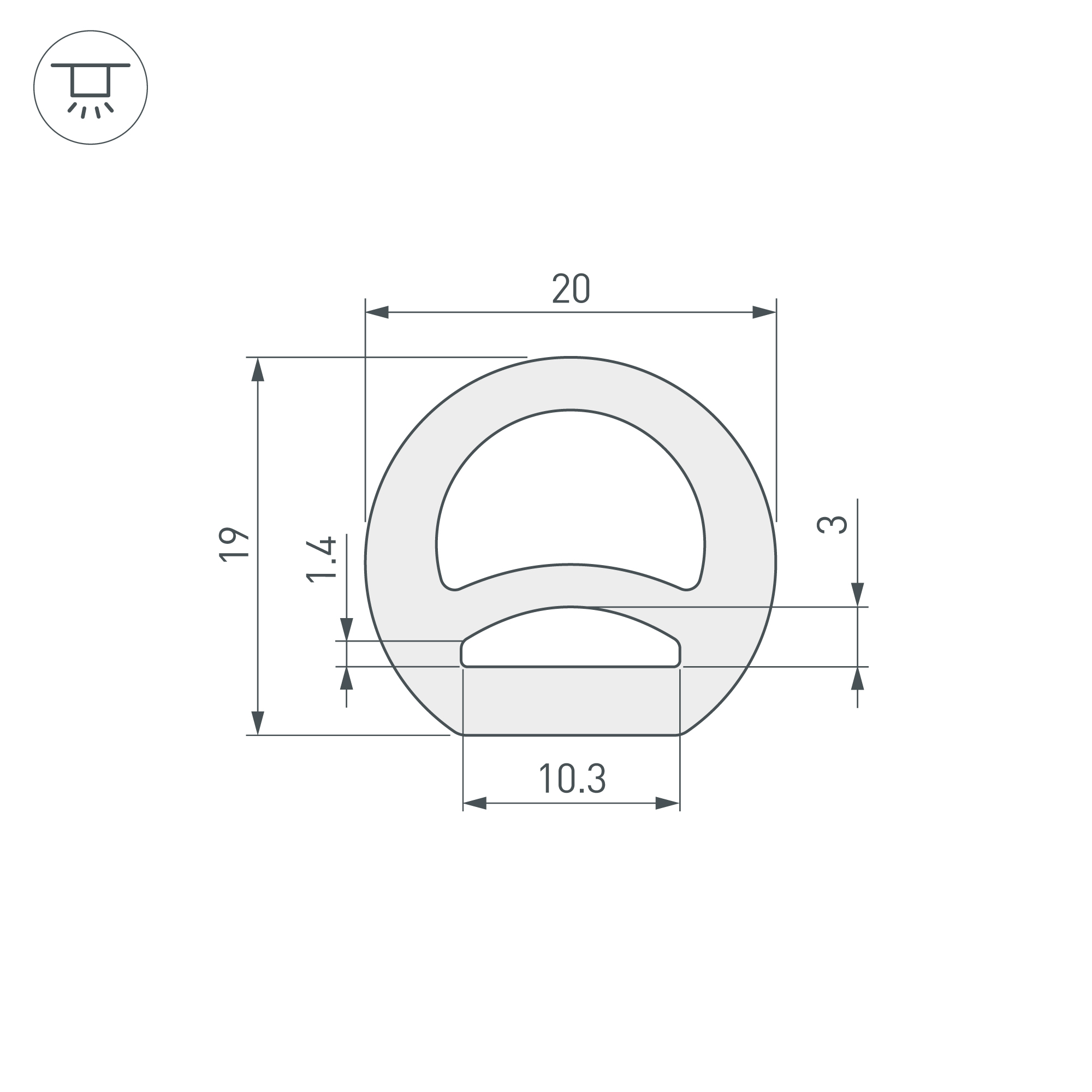 Цельнолитой силиконовый гибкий профиль, белый матовый. Габаритные размеры 5000×20×19 мм. Вертикальный изгиб TOP, минимальный радиус изгиба 60 мм. Для установки во влажных помещениях необходима герметизация при помощи двухкомпонентного эпоксидного герметика. Класс пылевлагозащиты – IP65 (при соблюдении технологии герметизации). Для лент шириной от 8 до 10 мм, высотой до 2,9 мм и мощностью до 10 Вт/м. Угол излучения 110°, поперечный угол излучения 205°. Поставляется в катушках по 5 м. Цена за 1 м.