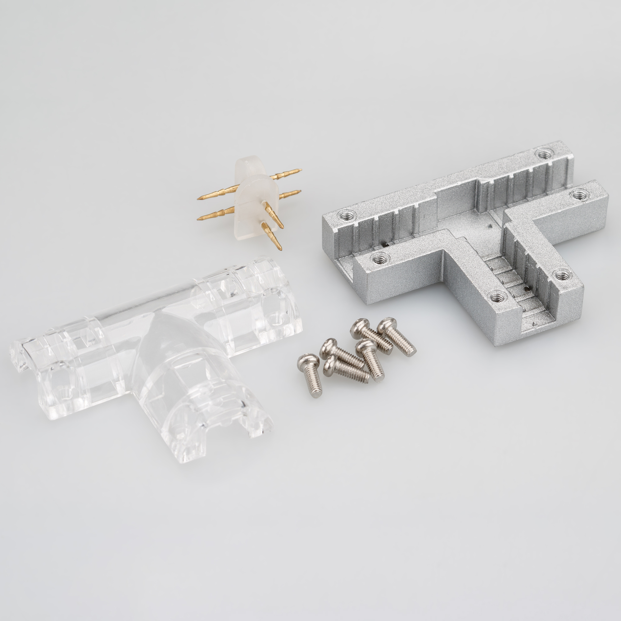 Тройной 2-х контактный соединитель для гибкого неона сечения 16x8mm серии NEON. Обеспечивает непрерывное соединение и сплошную линию свечения без разрывов. Требуется доп.герметизация для соединения IP65. Материал-алюминий, прозрачный пластик. Размеры ДхШ: 60х45мм. Цена за 1шт.