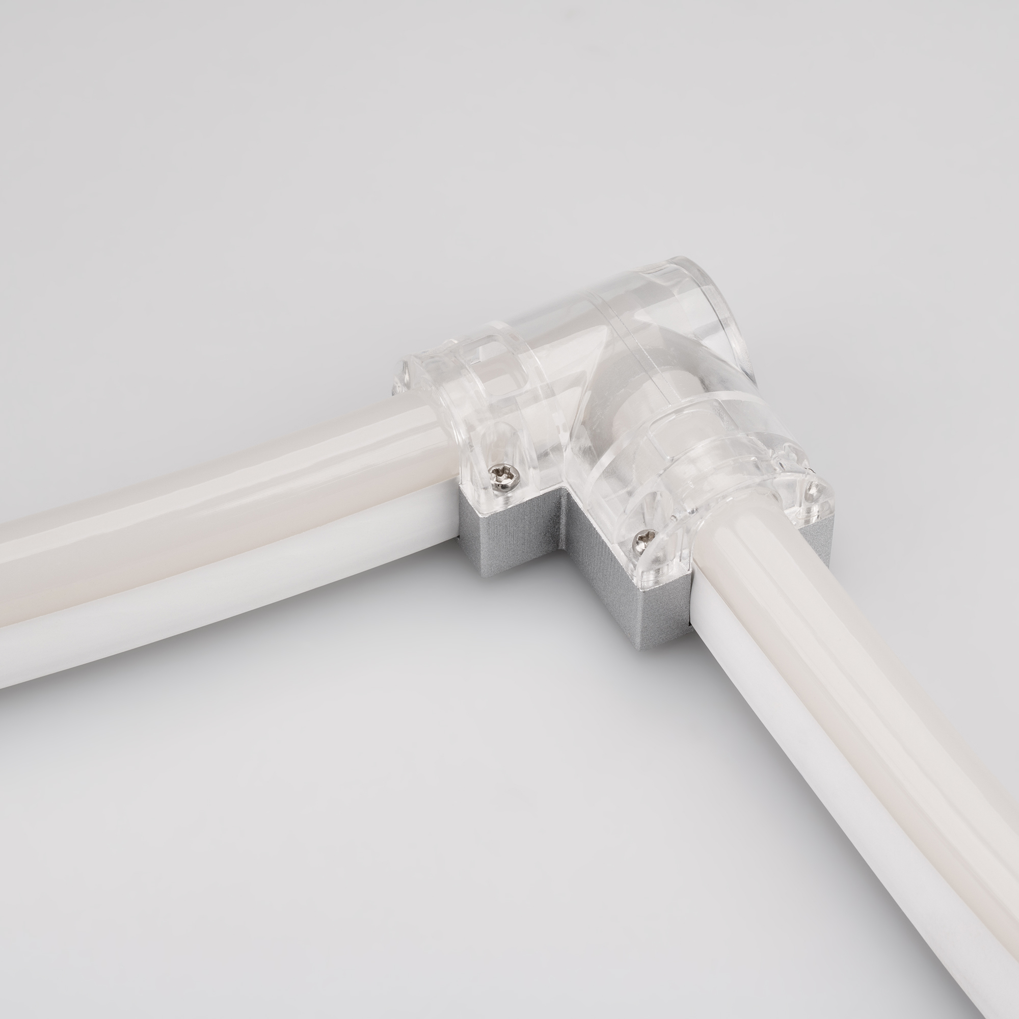 Угловой 2-х контактный соединитель для гибкого неона сечения 26x15mm серии NEON. Обеспечивает непрерывное соединение и сплошную линию свечения без разрывов. Требуется доп.герметизация для соединения IP65. Материал-алюминий, прозрачный пластик. Размеры ДхШ: 50х50мм. Цена за 1шт.