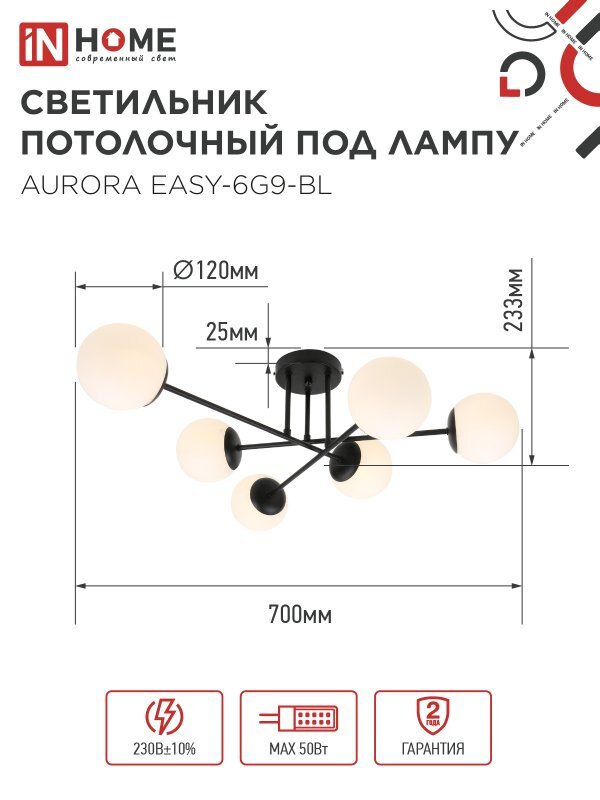 Светильник AURORA EASY-6G9-BL 6хG9 потолочн. под лампу; плафоны матов./корпус черн. IN HOME 4690612062785