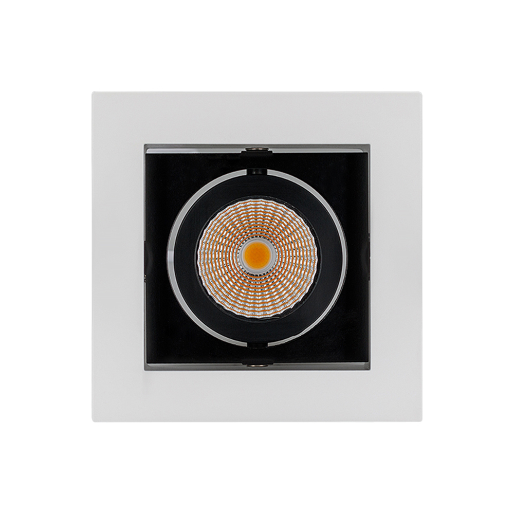 Встраиваемый карданный светильник. Угол 38° / 9Вт / ТЕПЛЫЙ БЕЛЫЙ 3000K / 680лм, CRI>80. Корпус из белого алюминия с черными вставками. Питание AC180-240V, 9Вт, в комплекте драйвер 200mA 30-45V. Размеры LxWxH: 102х102x85мм, отверстие для установки 85x85мм.