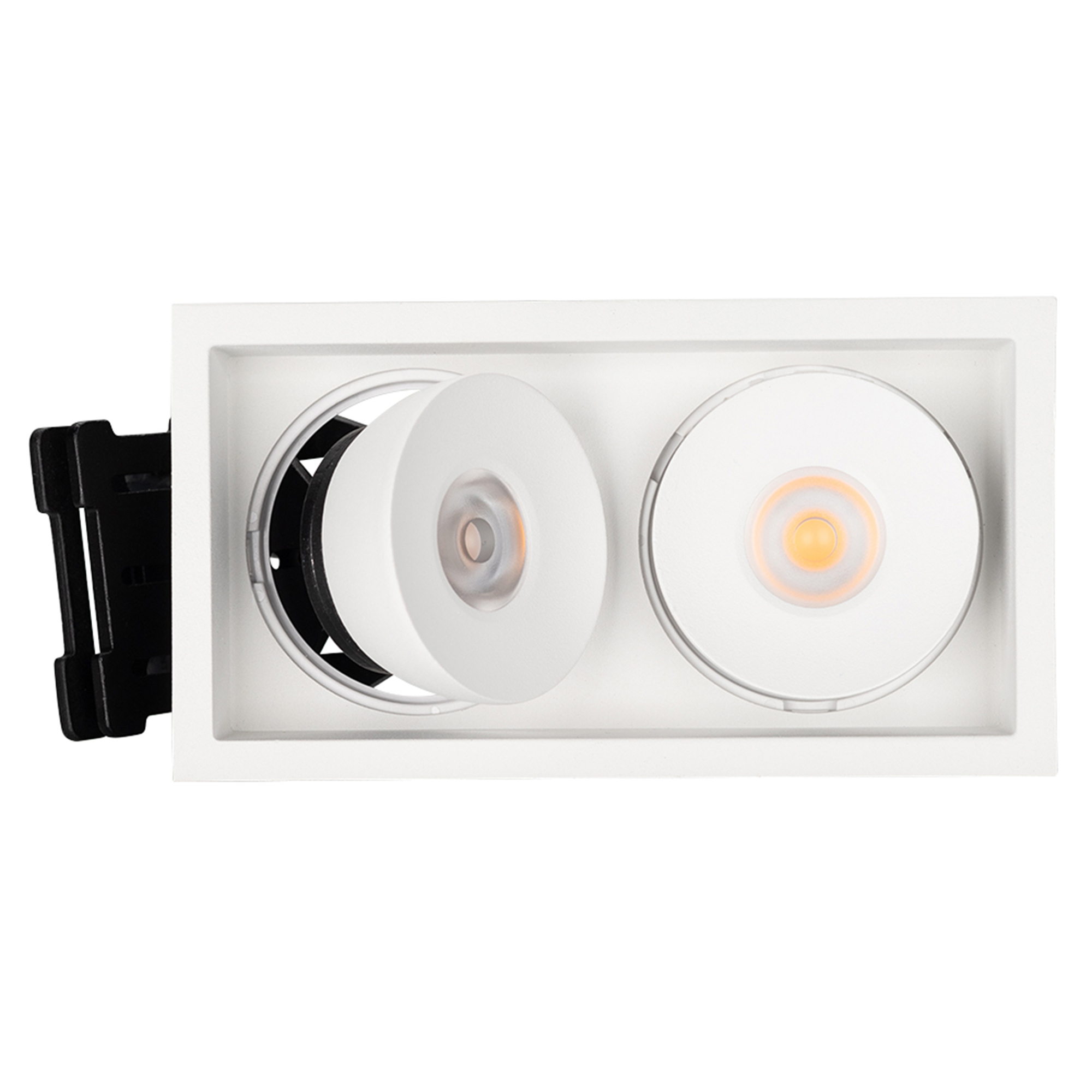 Встраиваемый поворотный светильник для потолка. Мощность 2x9W, цвет ТЕПЛЫЙ 3000K, св.поток 1260лм, угол 45°, RA>90. Корпус прямоугольный белый. Питание AC180-240V. Размеры LxWxH 148x80x90мм. Установка в отверстие 140x70мм. Драйвер в комплекте 2 шт (30-45V, 220mA).