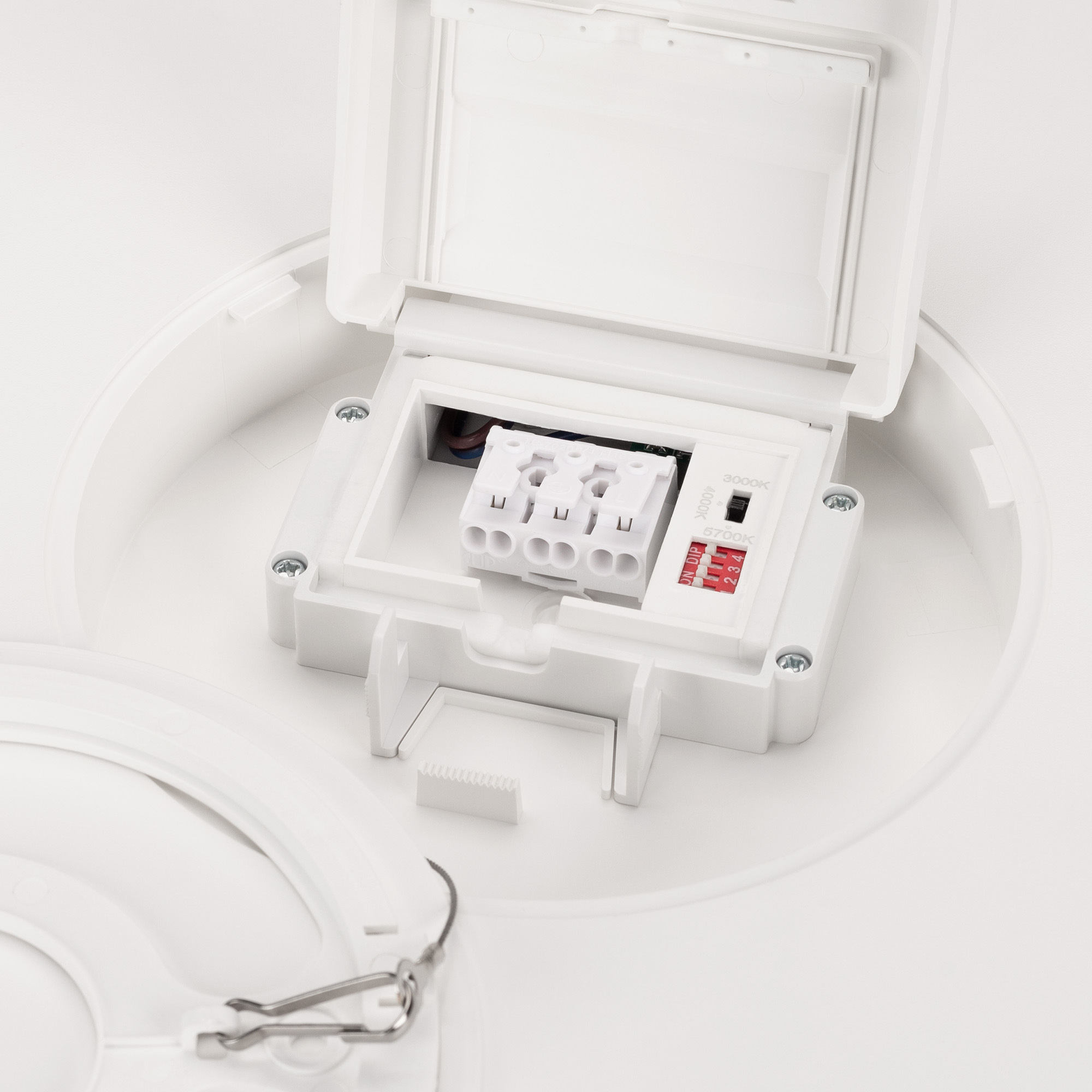 Светодиодный светильник с блоком аварийного питания, с изменяемой мощностью и цветовой температурой. Мощность 22-32 Вт (переключается), мощность в режиме заряда и контроля АКБ 5 Вт, св. поток 2530-3570 лм, 110 лм/Вт, световой поток в аварийном режиме 400 лм, теплый 3000 K, дневной 4000K, белый 5700K, CRI>80, угол 110°, напряжение питания 230 В. Черный круглый корпус из пластика, экран PC, степень защиты IP54. Размер: длина 410 мм, ширина 410 мм, высота 76 мм. Монтаж накладной. Драйвер 75-130 В, 185/275 мА, пульсация <5%. Тип батареи: Li-ion, напряжение батареи 7.4 В, емкость батареи 2600 мАч, время работы в автономном режиме: до 3 ч.