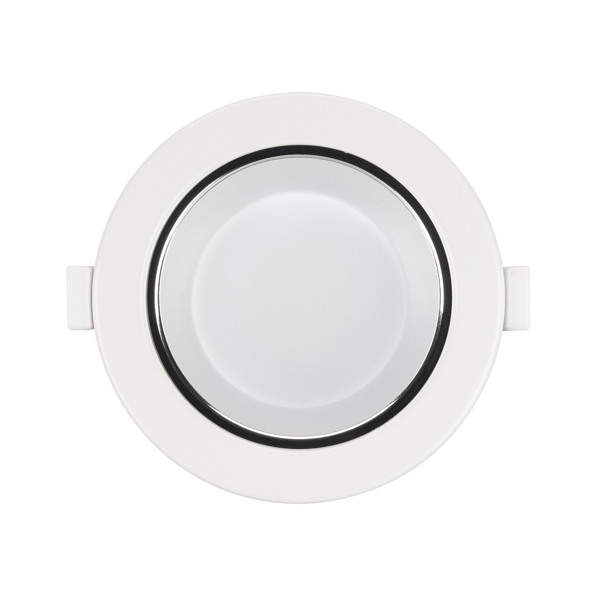Светильник даунлайт с изменяемой цветовой температурой и переключателем на корпусе. Мощность 10 Вт, св. поток 880 лм, 88 лм/Вт, белый 6000К, или дневной 4000К, или теплый 3000К (выбор цвета свечения при установке, фиксированный), CRI>80, угол 80°, напряжение питания 230 В. Белый круглый корпус из алюминия, степень защиты IP20. Размер: диаметр 113 мм, высота 59 мм. Монтаж встраиваемый, установочное отверстие: диаметр 90-102 мм. Драйвер 18-35 В, 350 мА, пульсация <0,7%.