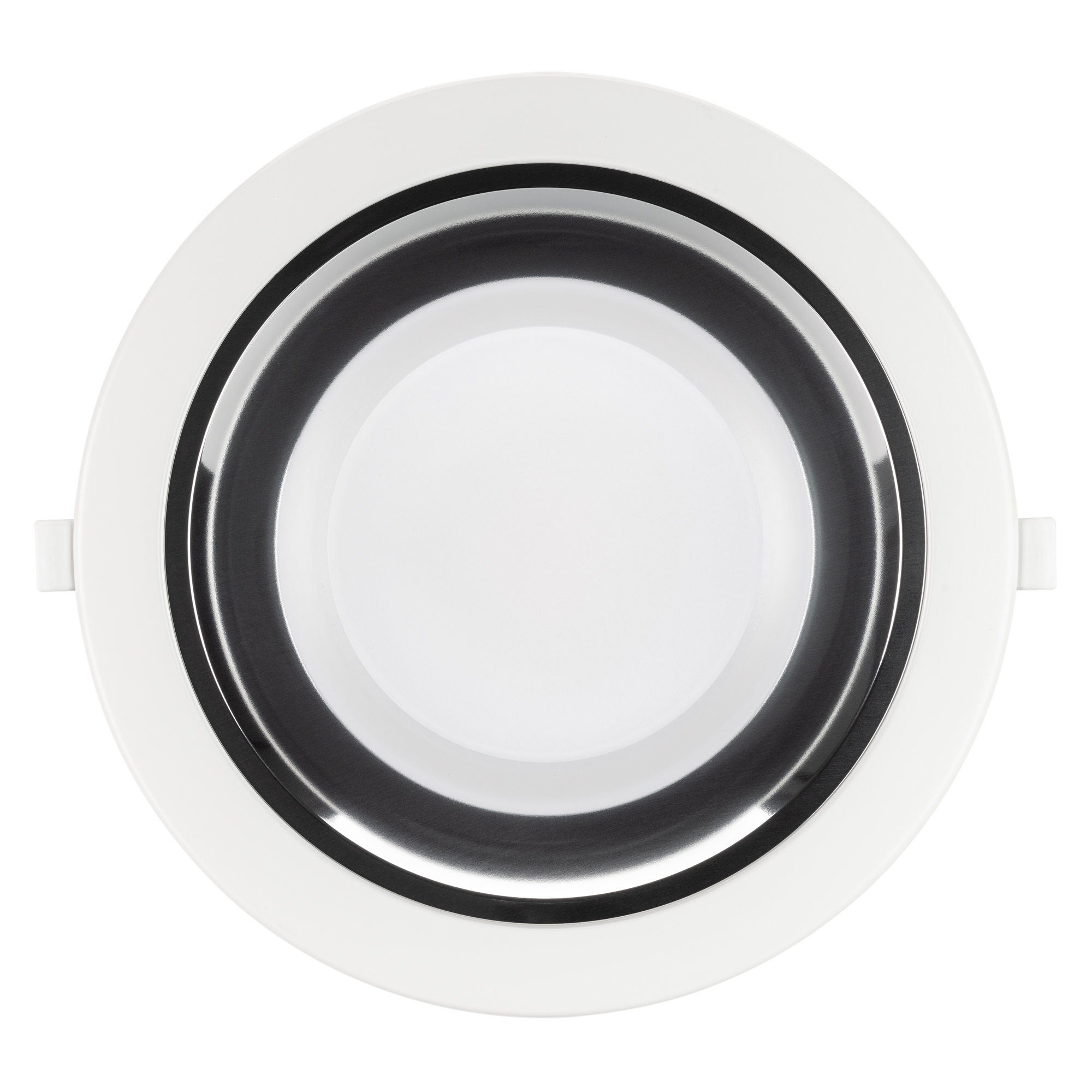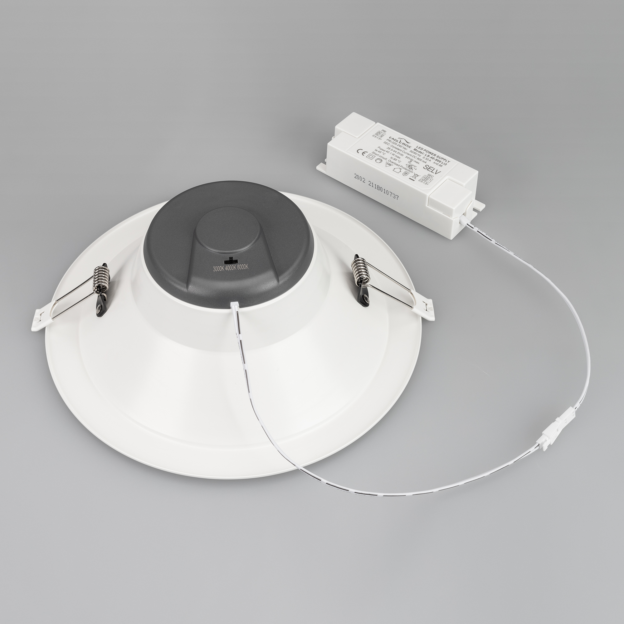 Светильник даунлайт с изменяемой цветовой температурой и переключателем на корпусе. Мощность 35 Вт, св. поток 4038-4230 лм, 106 лм/Вт, белый 6000К, или дневной 4000К, или теплый 3000К (выбор цвета свечения при установке, фиксированный), CRI>80, угол 80°, напряжение питания 230 В. Белый круглый корпус из алюминия, степень защиты IP20. Размер: диаметр 232 мм, высота 83 мм. Монтаж встраиваемый, установочное отверстие: диаметр 195-210 мм. Драйвер 26,5-44,5 В, 900 мА, пульсация <0,7%.