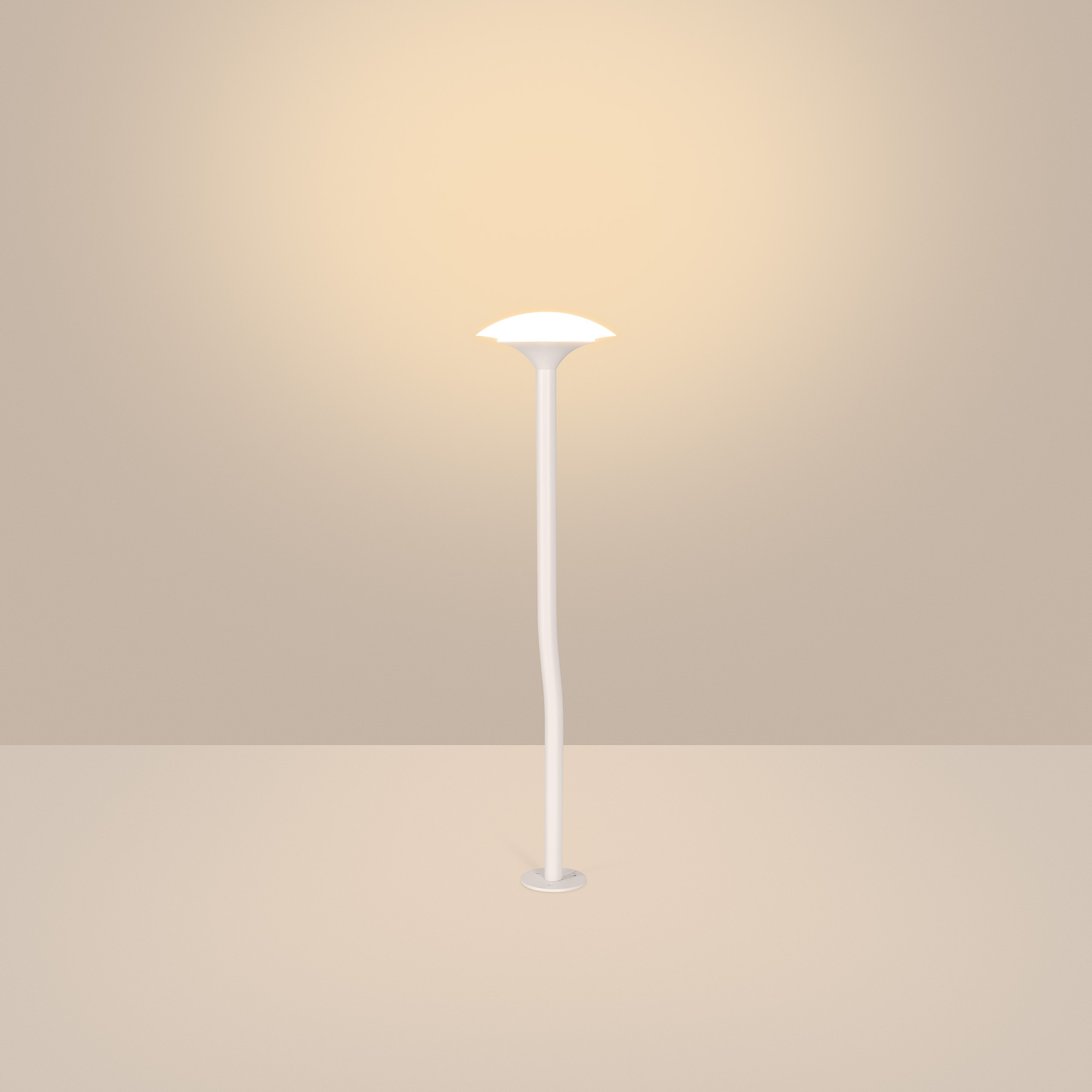 Уличный декоративный светодиодный светильник. Мощность 2 Вт, св. поток 252 лм, 122 лм/Вт, теплый 3000 K, CRI>80, угол излучения 100°, напряжение питания 24 В. Белый корпус из алюминия, прозрачный матовый рассеиватель из PMMA. Степень защиты IP65. Размер: диаметр 98 мм, высота 450 мм, высота углубления 155 мм. Монтаж в грунт с помощью основания пика (входит в комплект поставки). Драйвер приобретается отдельно.