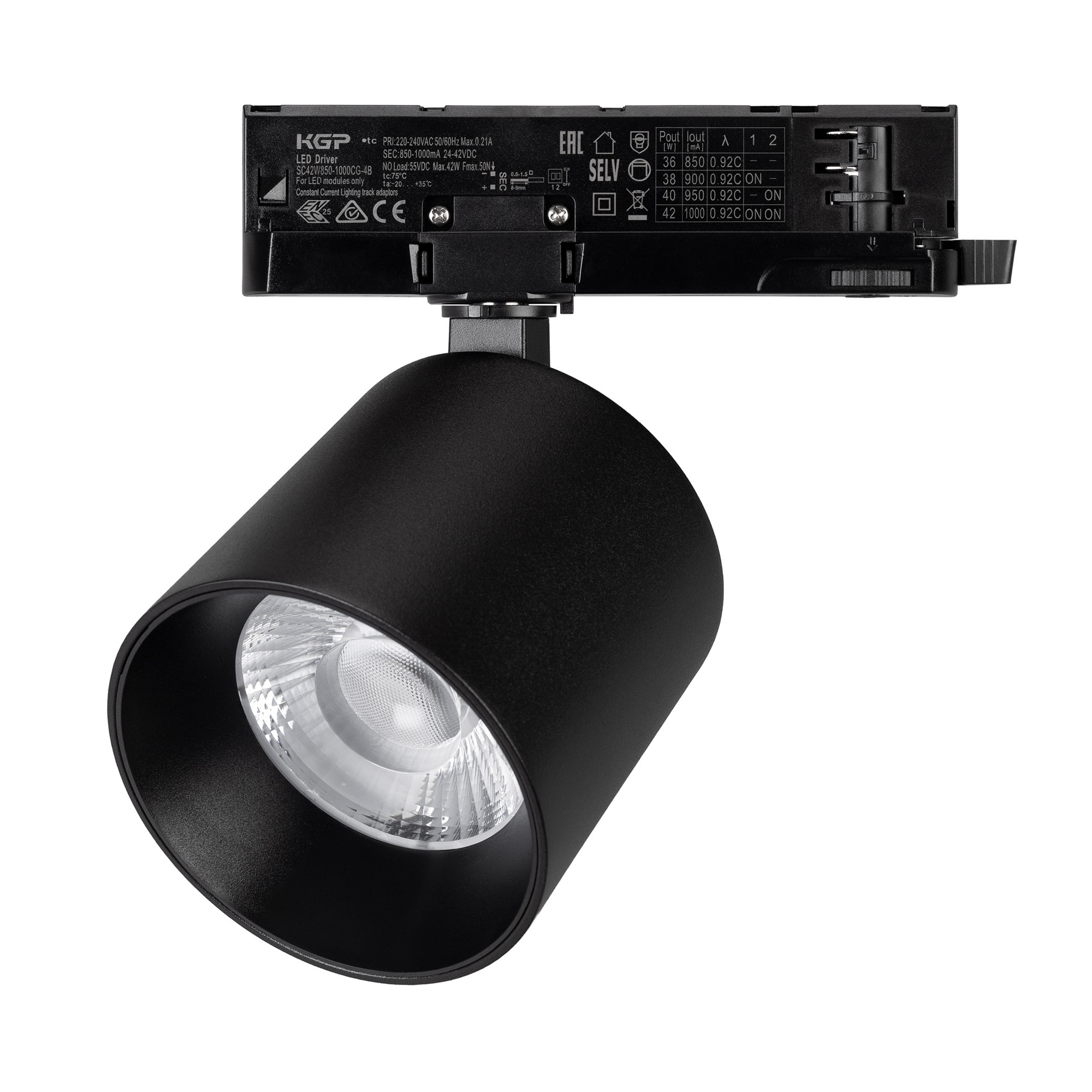Светильник для трехфазных треков, 36 Вт с управлением TRIAC. Цвет свечения ДНЕВНОЙ 4000K, световой поток 3200 лм, угол 50°, CRI>90. Корпус круглый, металл, цвет черный, IP20. Размеры Ø100x93 мм. Входное напряжение AC220-240V. Драйвер встроенный 9-40В (300 - 1050мА), 50/60Гц, максимальная мощность 42 Вт.