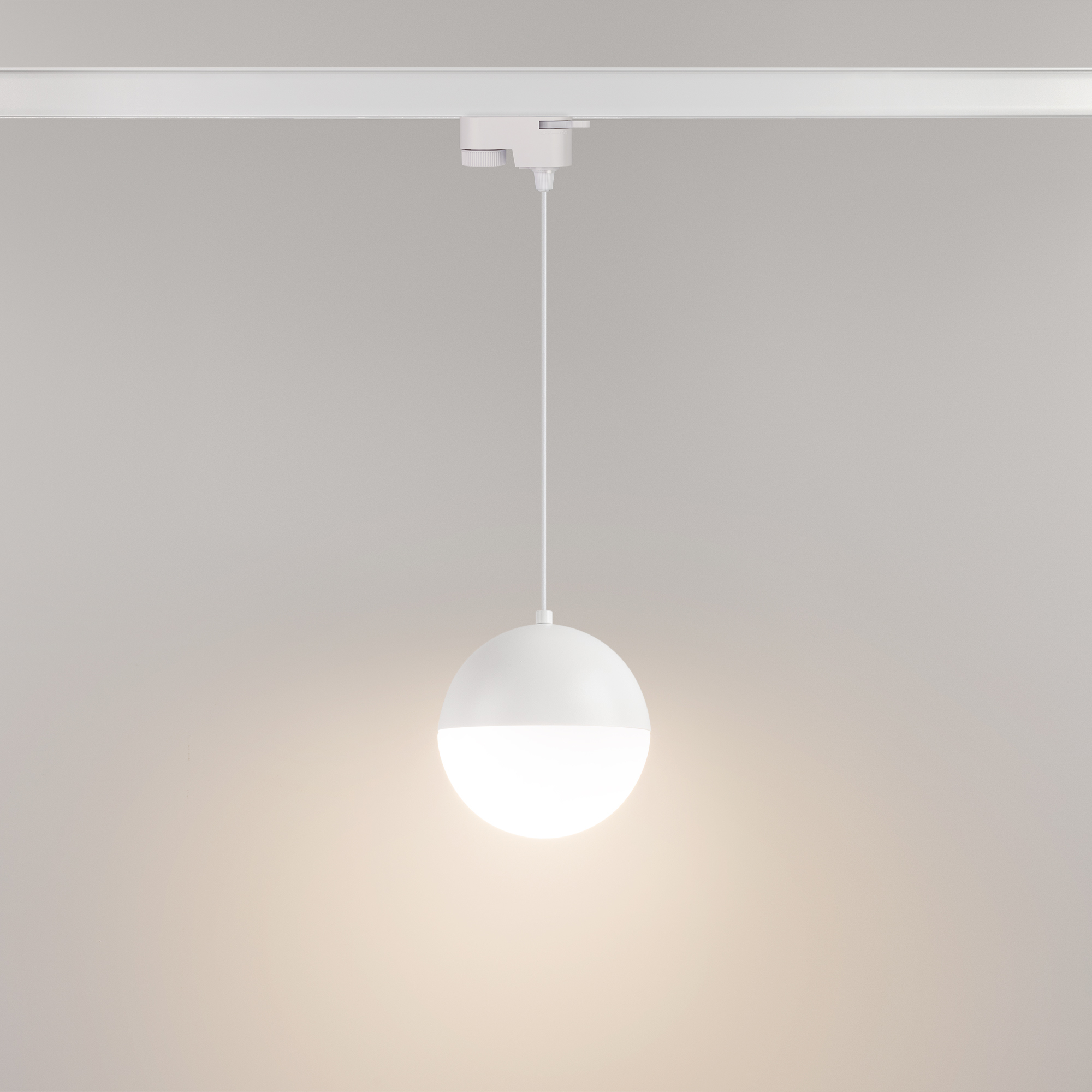 Светильник для треков/шин 2 провода. Мощность 11 Вт, св. поток 960 лм, 80 лм/Вт, теплый 3000 K, CRI>90, угол 170°, напряжение питания 230 В. Белый корпус из алюминия, материал плафона стекло, степень защиты IP20. Размер: диаметр 150 мм, длина подвеса 1500 мм. Монтаж на трек 1-фазный. Драйвер 28-42 В, 250 мА, пульсация <1%.