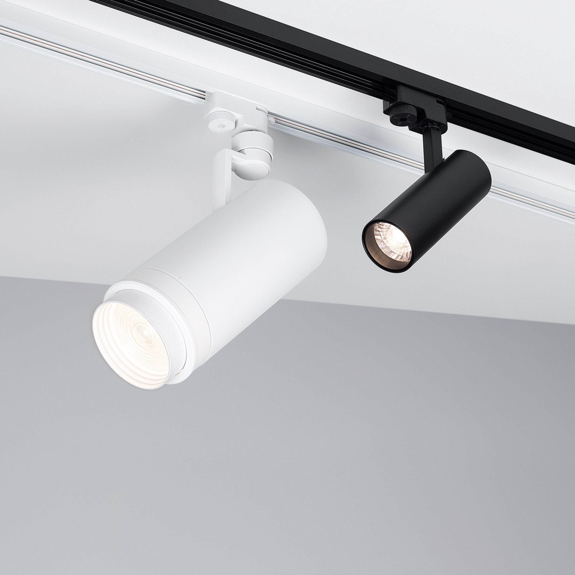 Светильник для треков/шин 2 провода. Мощность 20 Вт, св. поток 1800-2200 лм, 90 лм/Вт, дневной 4000 K, CRI>90, угол 24°, напряжение питания 230 В. Черный круглый корпус из алюминия, материал линзы PMMA , степень защиты IP20. Размер: диаметр 74 мм, высота 160 мм. Монтаж на трек 1-фазный. Драйвер встроенный 30-42 В, 500 мА., пульсация <1%.