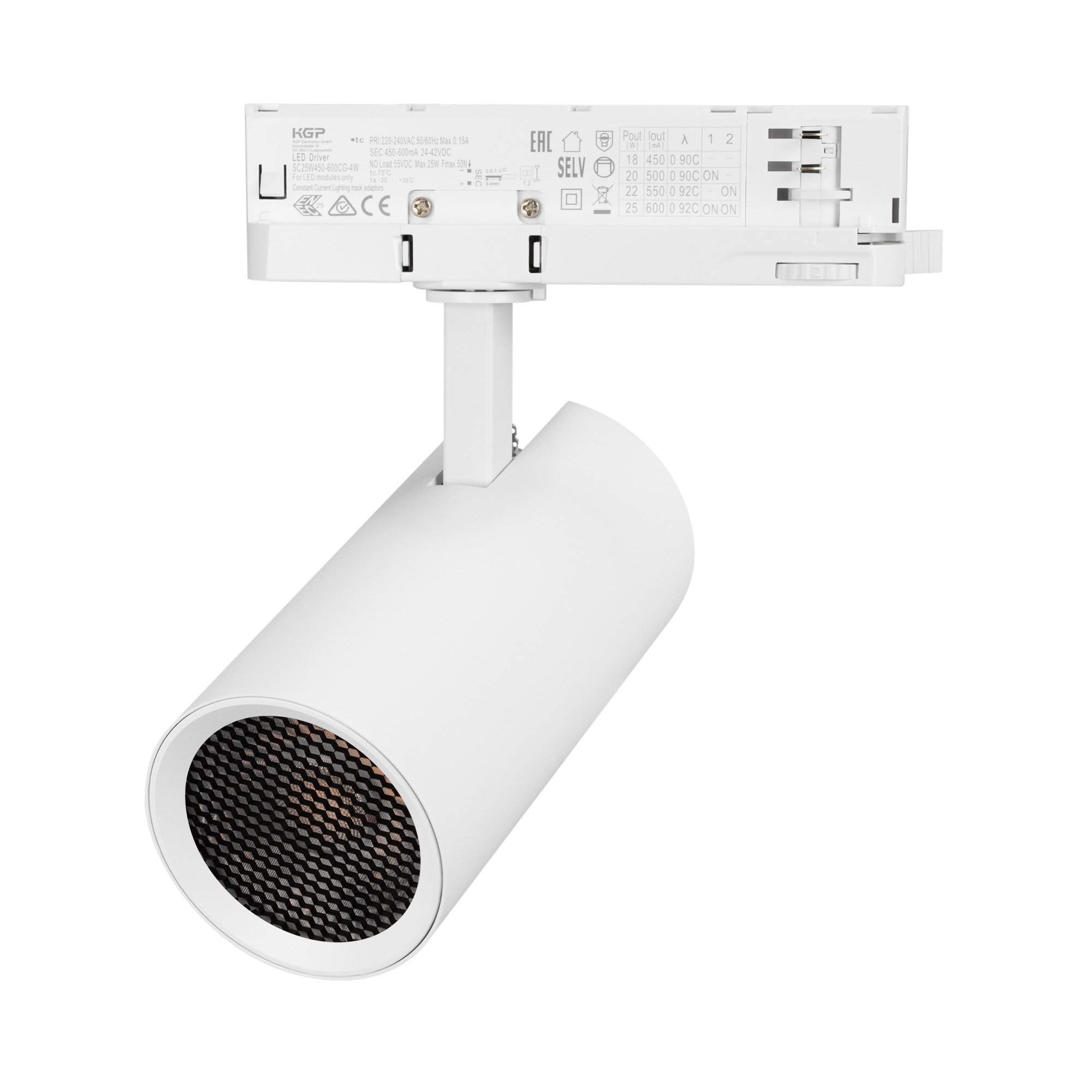 Светильник для треков/шин 4 провода. Мощность 20 Вт, св. поток без решетки honeycomb 2000 лм, 100 лм/Вт, с решеткой honeycomb 1320 лм, 66 лм/Вт, дневной 4000 K, CRI>90, угол 36°, напряжение питания 230 В. Белый круглый корпус из алюминия, материал линзы PMMA, степень защиты IP20. Антибликовая решетка honeycomb в комплекте. Размер: диаметр 74 мм, длина световой части 154 мм. Монтаж на трек 3-фазный. Драйвер встроенный 24-42 В, 500мА., пульсация <5%