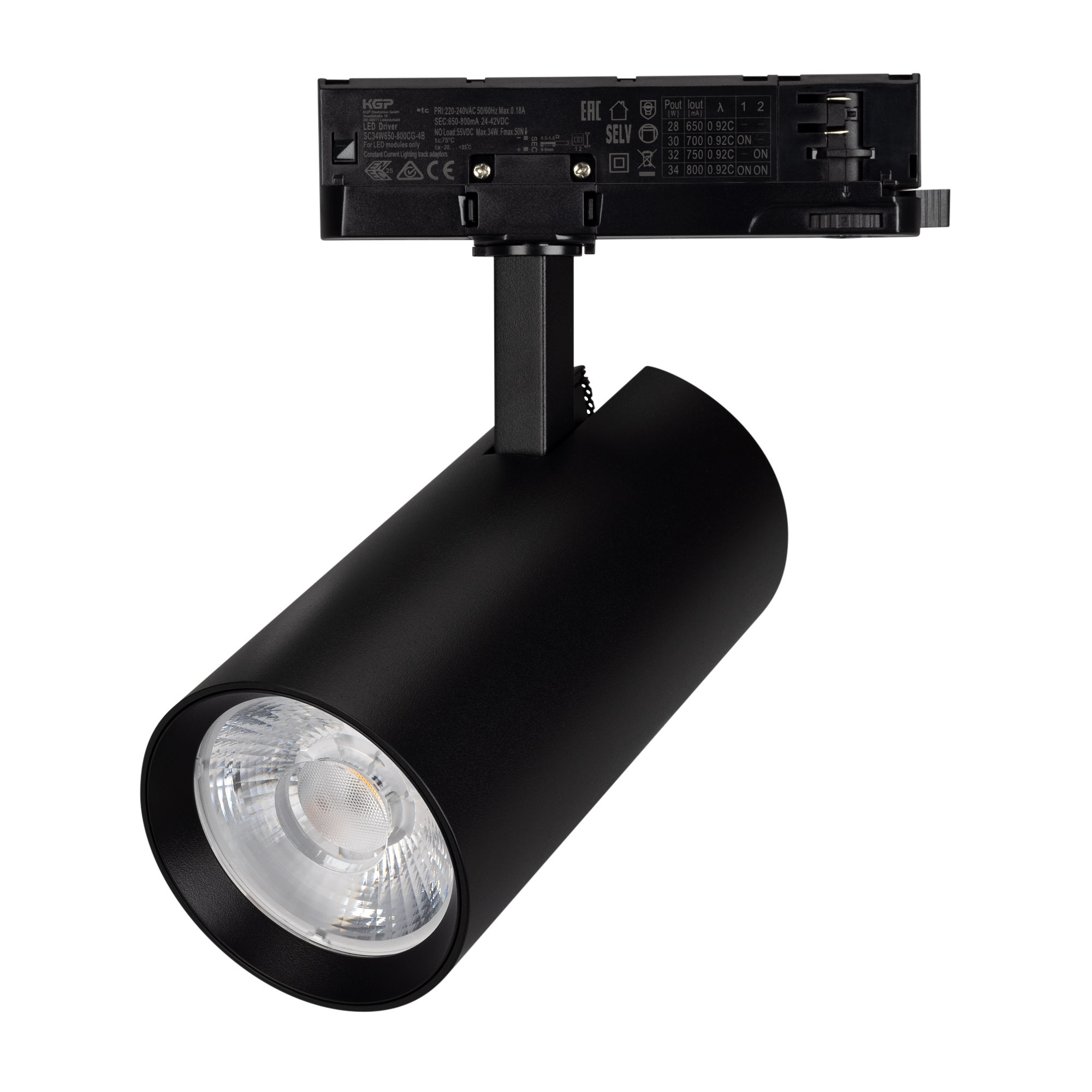 Светильник для треков/шин 4 провода. Мощность 30 Вт, св. поток без решетки honeycomb 3000 лм, 100 лм/Вт, с решеткой honeycomb 1980 лм, 66 лм/Вт, дневной 4000 K, CRI>90, угол 15°, напряжение питания 230 В. Черный круглый корпус из алюминия, материал линзы PMMA, степень защиты IP20. Антибликовая решетка honeycomb в комплекте. Размер: диаметр 90 мм, длина световой части 141 мм. Монтаж на трек 3-фазный. Драйвер встроенный 24-42 В, 750мА., пульсация <5%