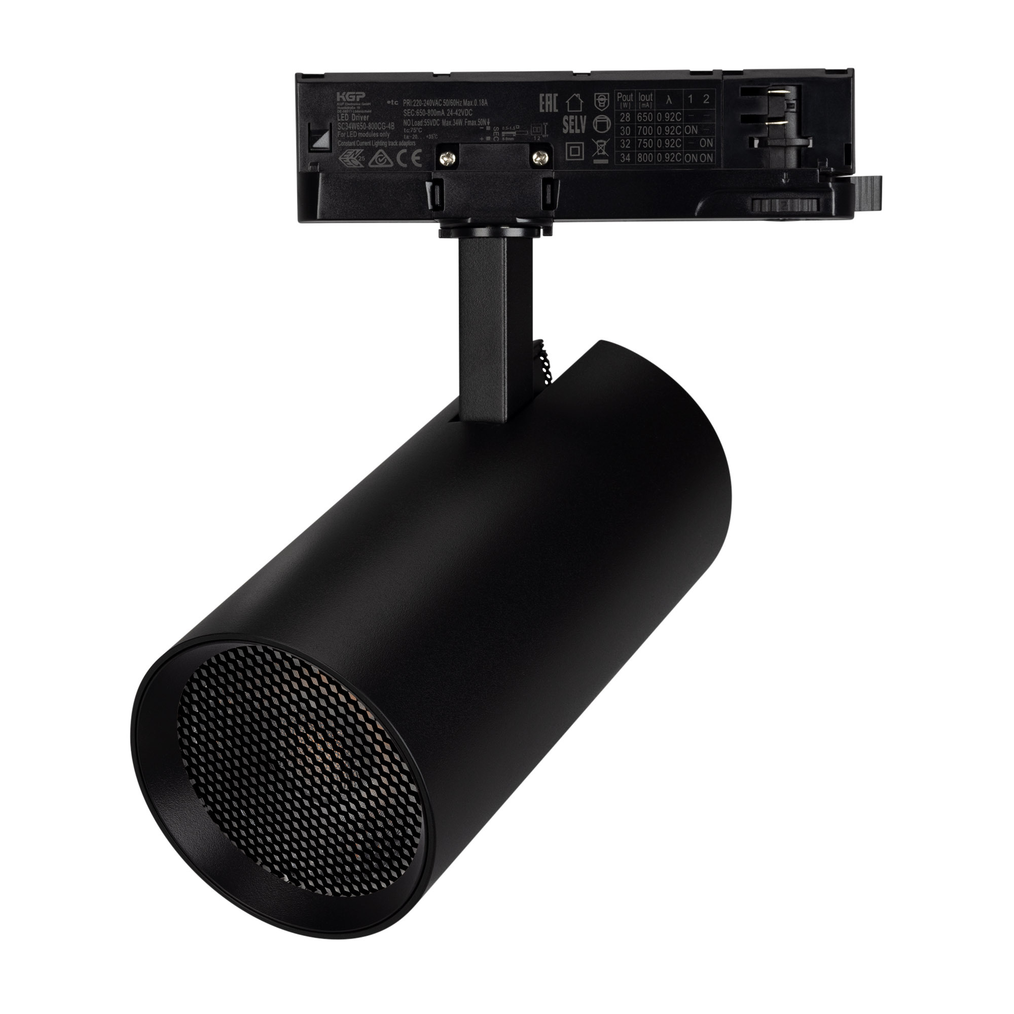 Светильник для треков/шин 4 провода. Мощность 30 Вт, св. поток без решетки honeycomb 3000 лм, 100 лм/Вт, с решеткой honeycomb 1980 лм, 66 лм/Вт, теплый 3000 K, CRI>90, угол 24°, напряжение питания 230 В. Черный круглый корпус из алюминия, материал линзы PMMA, степень защиты IP20. Антибликовая решетка honeycomb в комплекте. Размер: диаметр 90 мм, длина световой части 141 мм. Монтаж на трек 3-фазный. Драйвер встроенный 24-42 В, 750мА., пульсация <5%