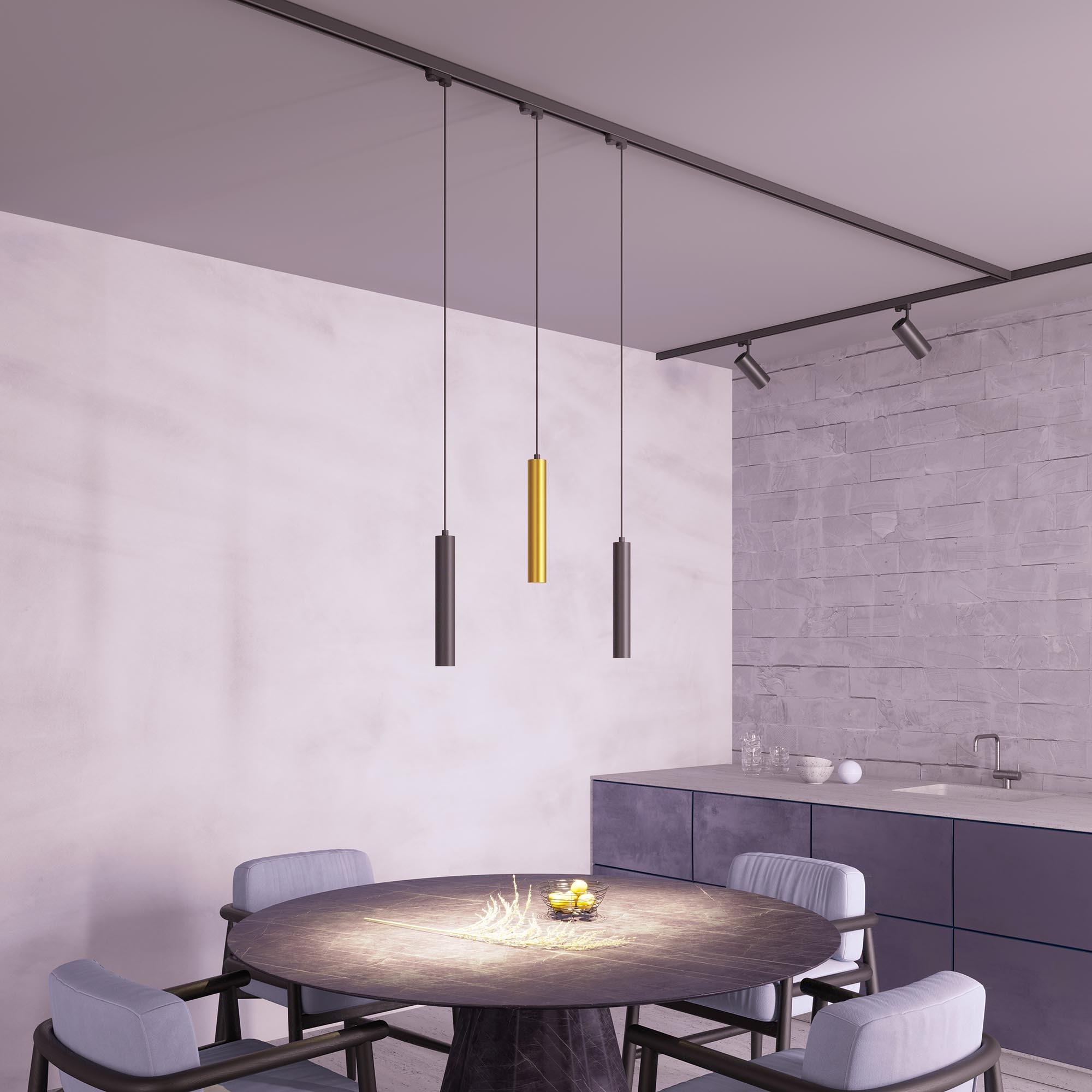 Светильник для треков/шин 2 провода. Мощность 9 Вт, св. поток 825 лм, 93 лм/Вт, теплый 3000 K, CRI>90, угол 40°, напряжение питания 230 В. Золотой корпус из алюминия, материал рассеивателя PC, степень защиты IP20. Размер: диаметр 50 мм, длина 310 мм, длина подвеса 1500 мм. Монтаж на трек 1-фазный. Драйвер 30-45 В, 220 мА, пульсация <1%.