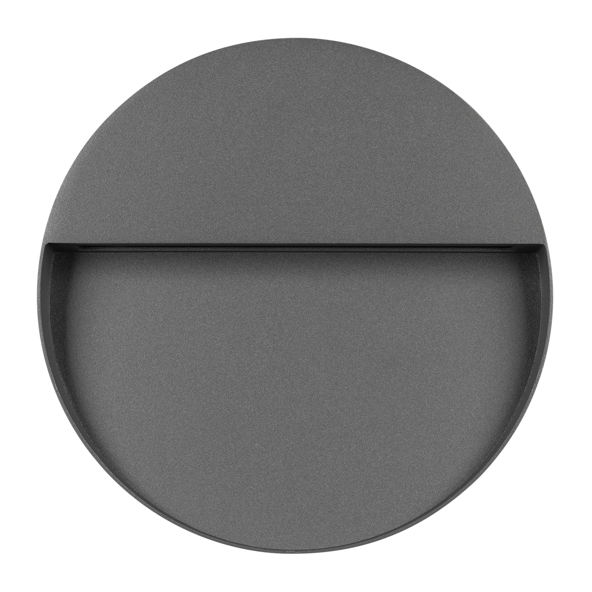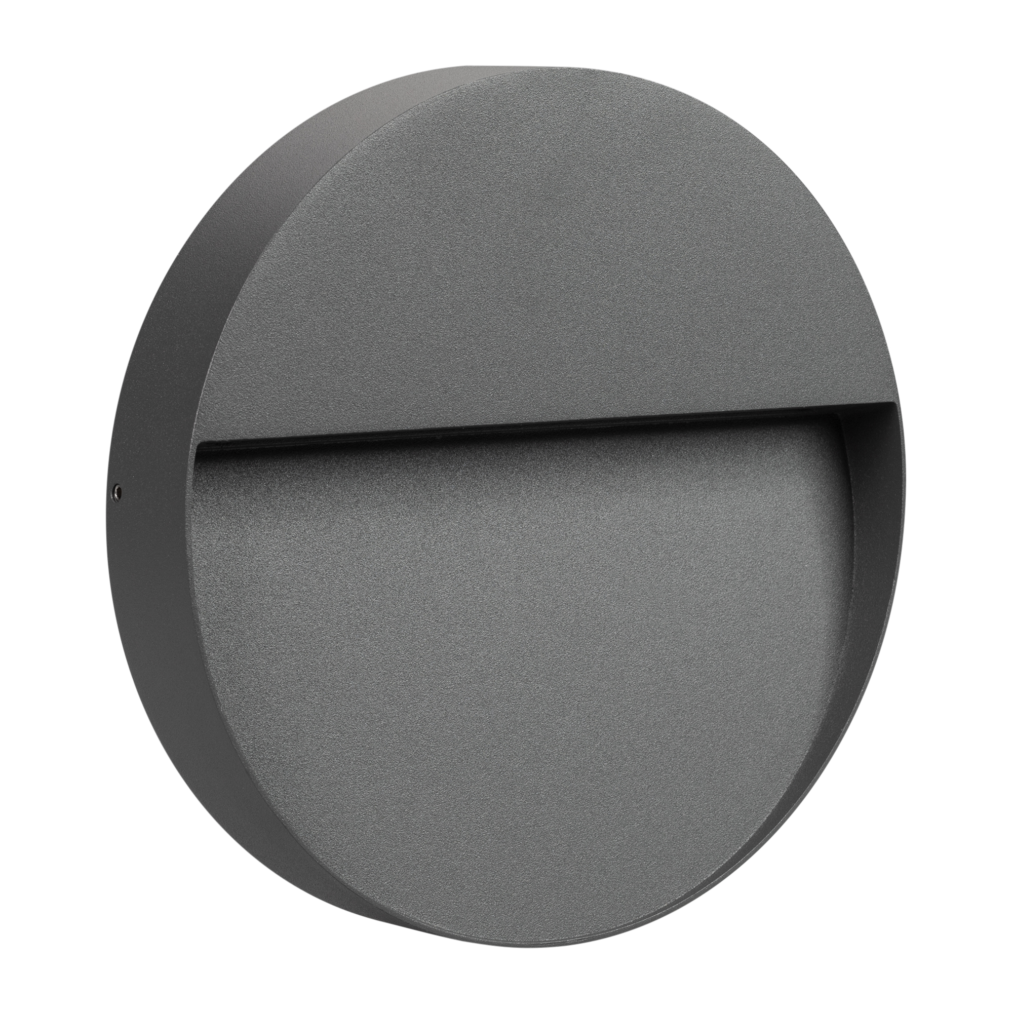 Светодиодный накладной круглый светильник для стен, лестниц, 8Вт. Цвет ТЕПЛЫЙ БЕЛЫЙ 3000K, св.поток 300лм, CRI(Ra)>80, угол 60°, асимметричный свет. Размер Ф215x36мм. Влагозащищенный корпус IP65, алюминий серого цвета. Питание AC230V, 8Вт, встроенный драйвер.