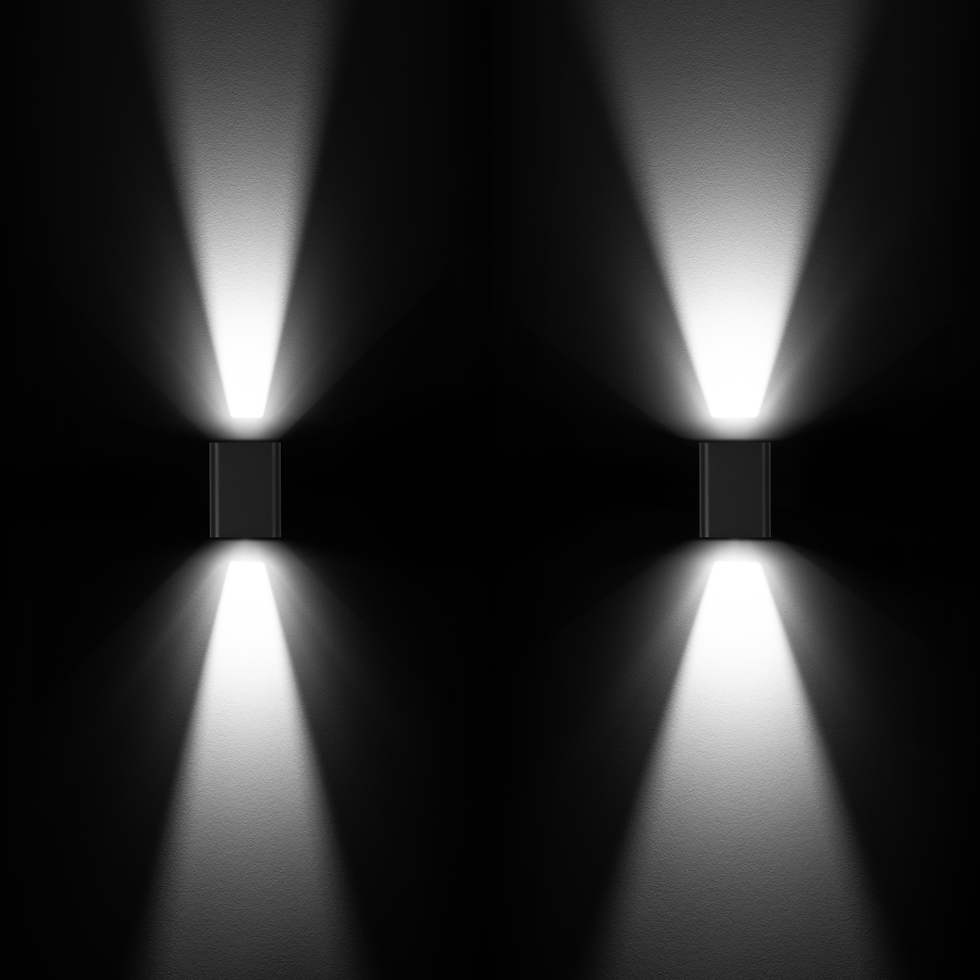 Уличный светодиодный светильник для стен, изменяемый угол освещения 0°-80°, свет вверх-вниз на 2 стороны. Цвет ТЕПЛЫЙ БЕЛЫЙ 3000К, светодиоды 2x6Вт CREE (750 лм). Влагозащищенный корпус IP54 - черный (RAL9011) алюминий, экран ударопрочный PC. Питание 230В, мощность 12 Вт. Размеры ВхШхГ -138х104х129 мм.