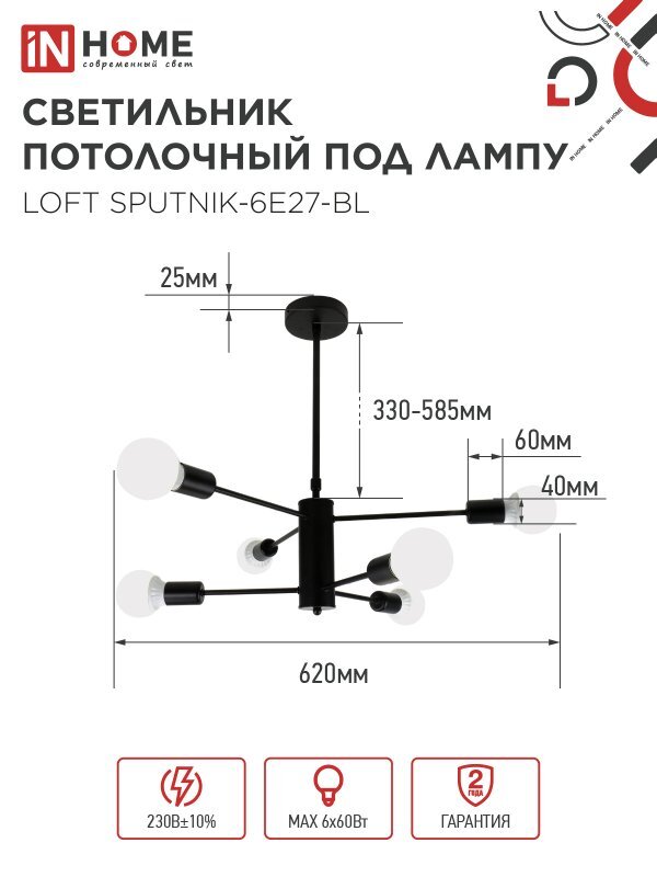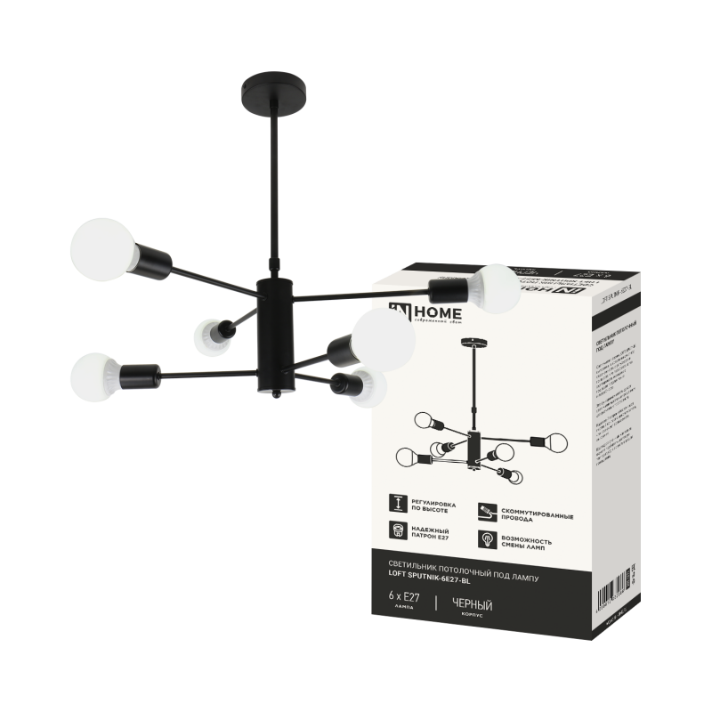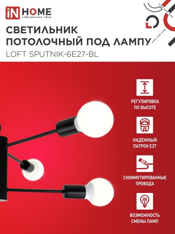 Светильник LOFT SPUTNIK-6E27-BL 6хE27 потолочн. под лампу; черн. IN HOME 4690612062686