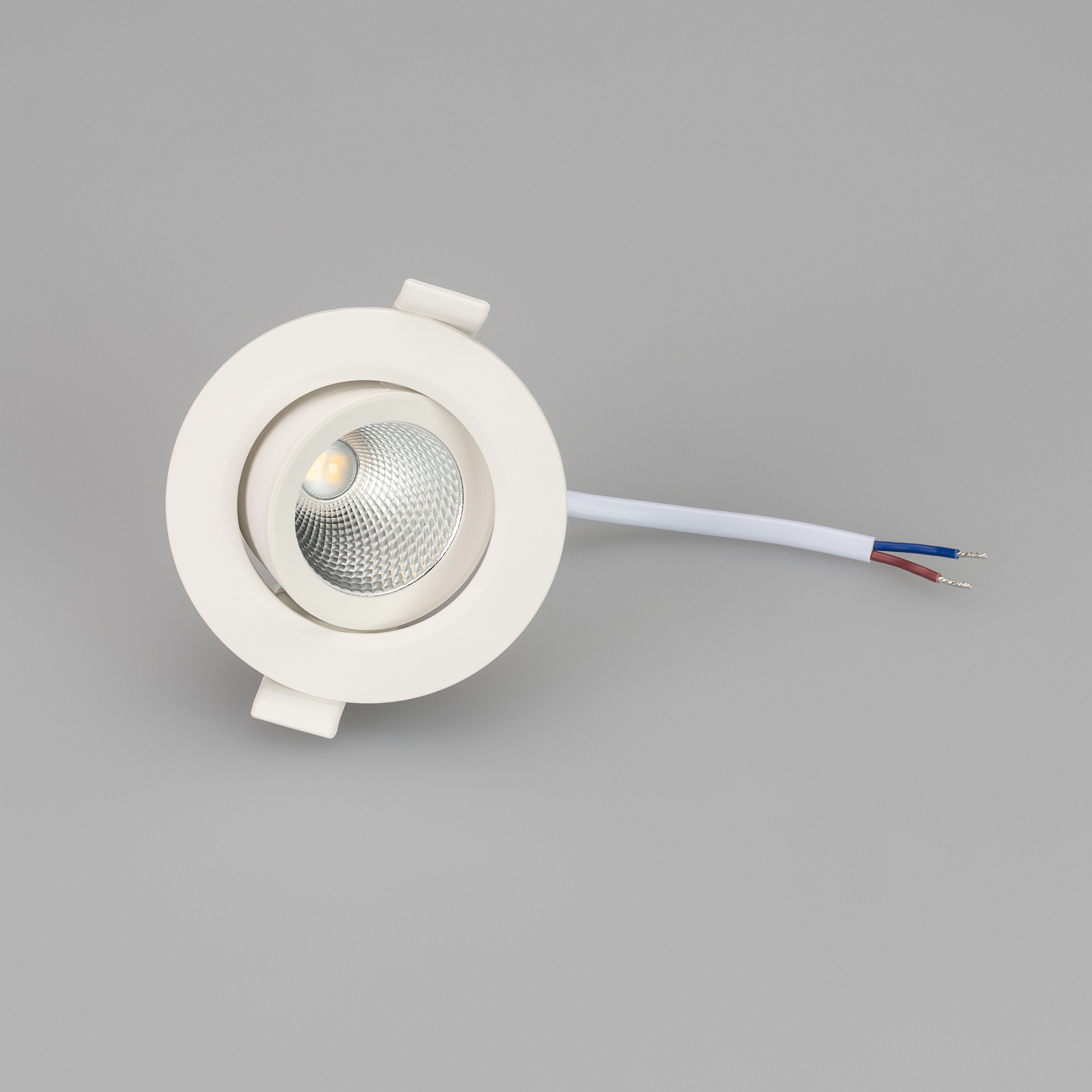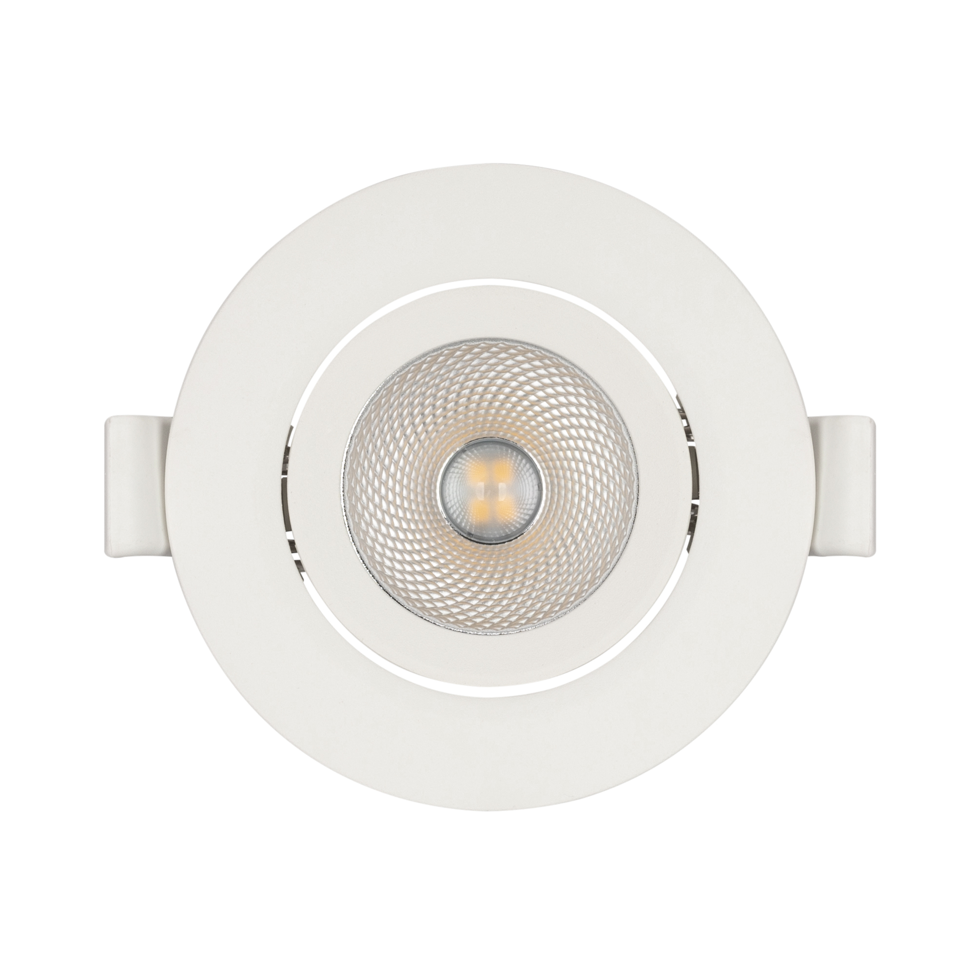 Встраиваемый поворотный светильник "даунлайт". Мощность 4.5 Вт, св. поток 400 лм, 89 лм/Вт, дневной 4000 K, CRI>80, UGR<19, угол 36°, напряжение питания 230 В. Белый круглый корпус из теплопроводящего полиамида, экран пластик, степень защиты IP20, угол поворота оси 30°. Размер: диаметр 80 мм, высота 37.5 мм. Монтаж встраиваемый, установочное отверстие диаметр 60-70 мм. Пульсация <2%.