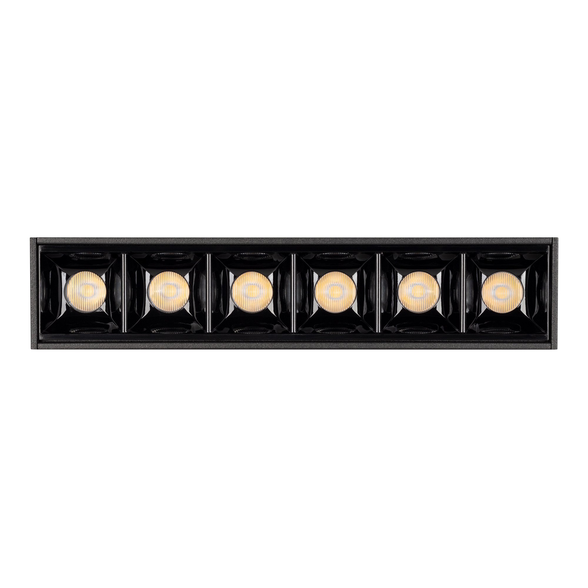 Светильник для магнитных треков шириной 45мм, 6Вт. Цвет свечения ТЕПЛЫЙ 3000K, световой поток 400лм, угол 15°, CRI>90. Корпус прямоугольный, металл, цвет черный, IP20. Размеры LxWxH 163x35x43мм. Входное напряжение DC24V, мощность 6Вт. Драйвер DС24V/AC230V поставляется отдельно. Диммируется только с 026407(1), 027633.