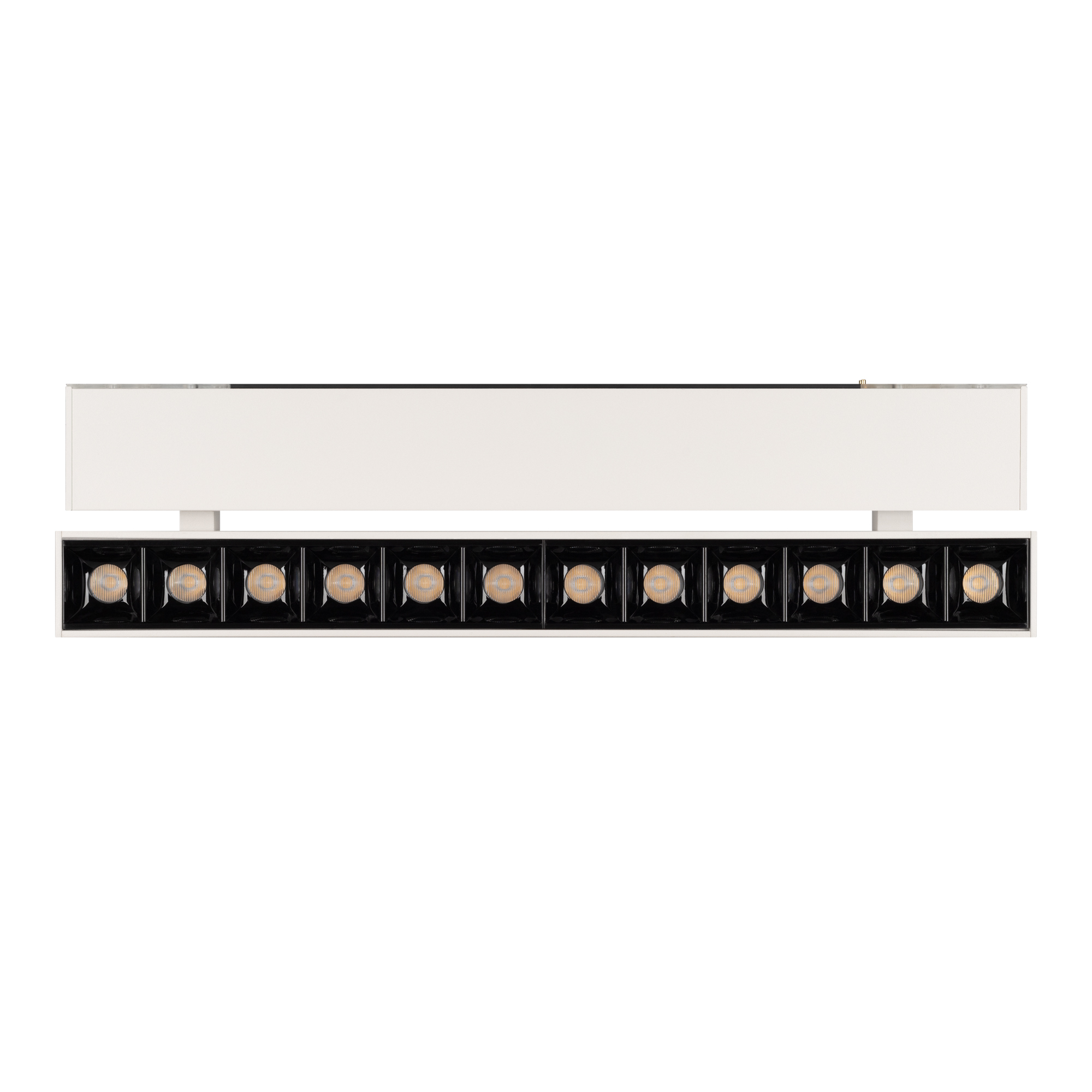 Светильник поворотный для магнитных треков шириной 45мм, 12Вт. Цвет свечения ТЕПЛЫЙ 3000K, световой поток 800лм, угол 15°, CRI>90. Корпус прямоугольный, металл, цвет белый, IP20. Размеры LxWxH 322x35x92.5мм. Входное напряжение DC24V, мощность 12Вт. Драйвер DС24V/AC230V поставляется отдельно. Диммируется только с 026407(1), 027633.