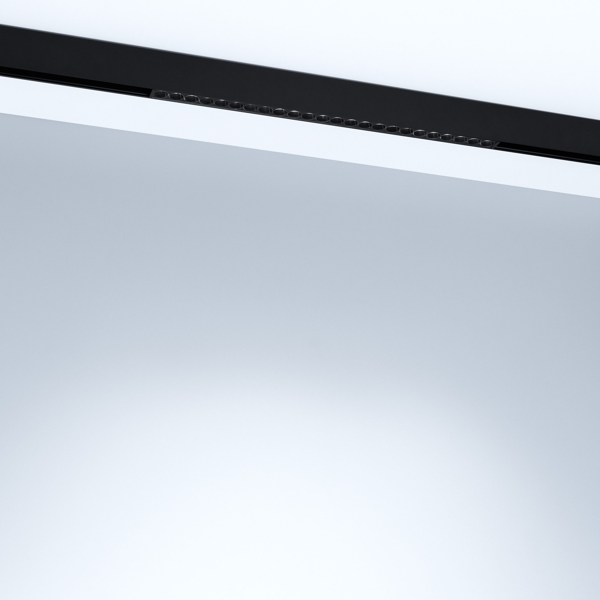 Светильник для магнитных треков MAG-ORIENT шириной 26 мм с управлением DALI(DT8) и изменяемой цветовой температурой. Мощность 16 Вт, св. поток 930-1200 лм, 58-75 лм/Вт, изменяемая цветовая температура 2700-6500 K, CRI>90, угол 24°, напряжение питания 48 В. Черный прямоугольный корпус из металл, экран поликарбонат, степень защиты IP20. Размер: длина 462 мм, ширина 22 мм, высота 42 мм. Монтаж на трек MAG-ORIENT. Пульсация <1%.