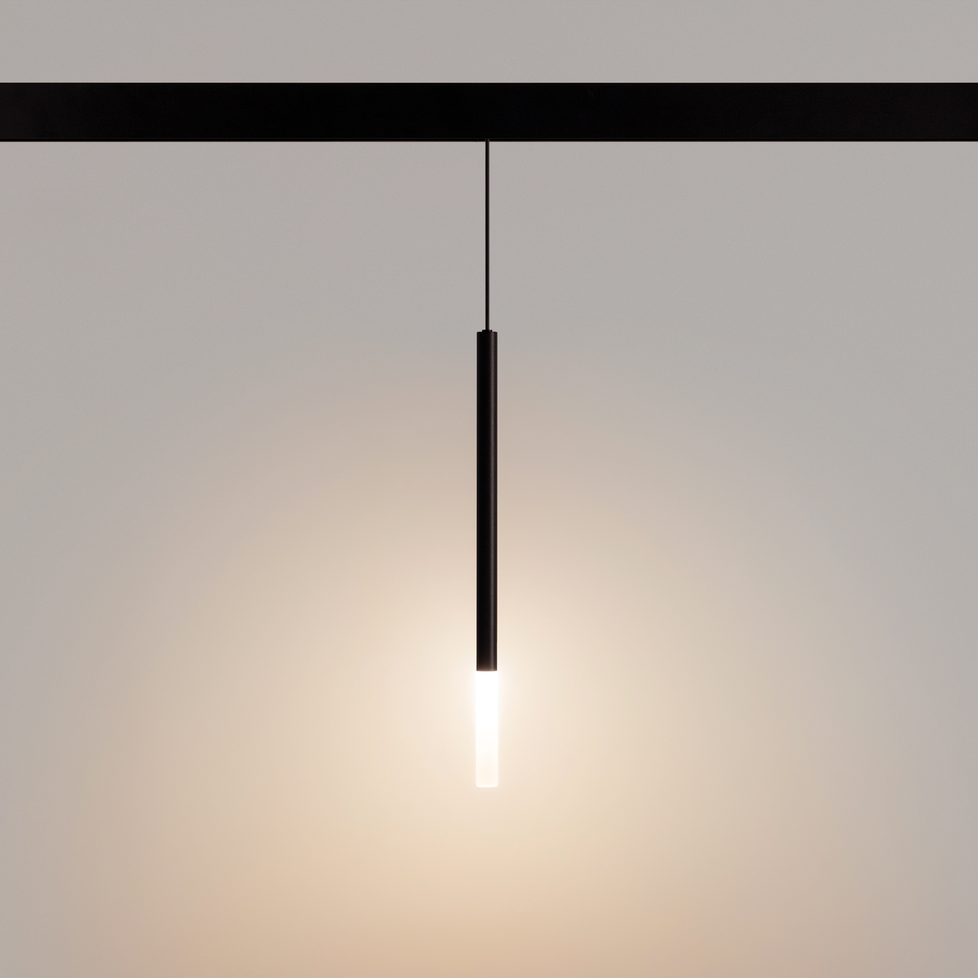 Светильник для магнитных треков MAG-ORIENT шириной 26 мм. Мощность 6 Вт, св. поток 100 лм, теплый 3000 K, CRI>90, угол 180°, напряжение питания 48 В. Черный цилиндрический корпус из металл, степень защиты IP20. Размер: длина светоизлучающего модуля 120 мм, длина светильника 450 мм ширина 20 мм, высота с учетом подвеса 2000 мм. Монтаж на трек MAG-ORIENT. Пульсация <1%. UGR<16. Подвес регулируется.