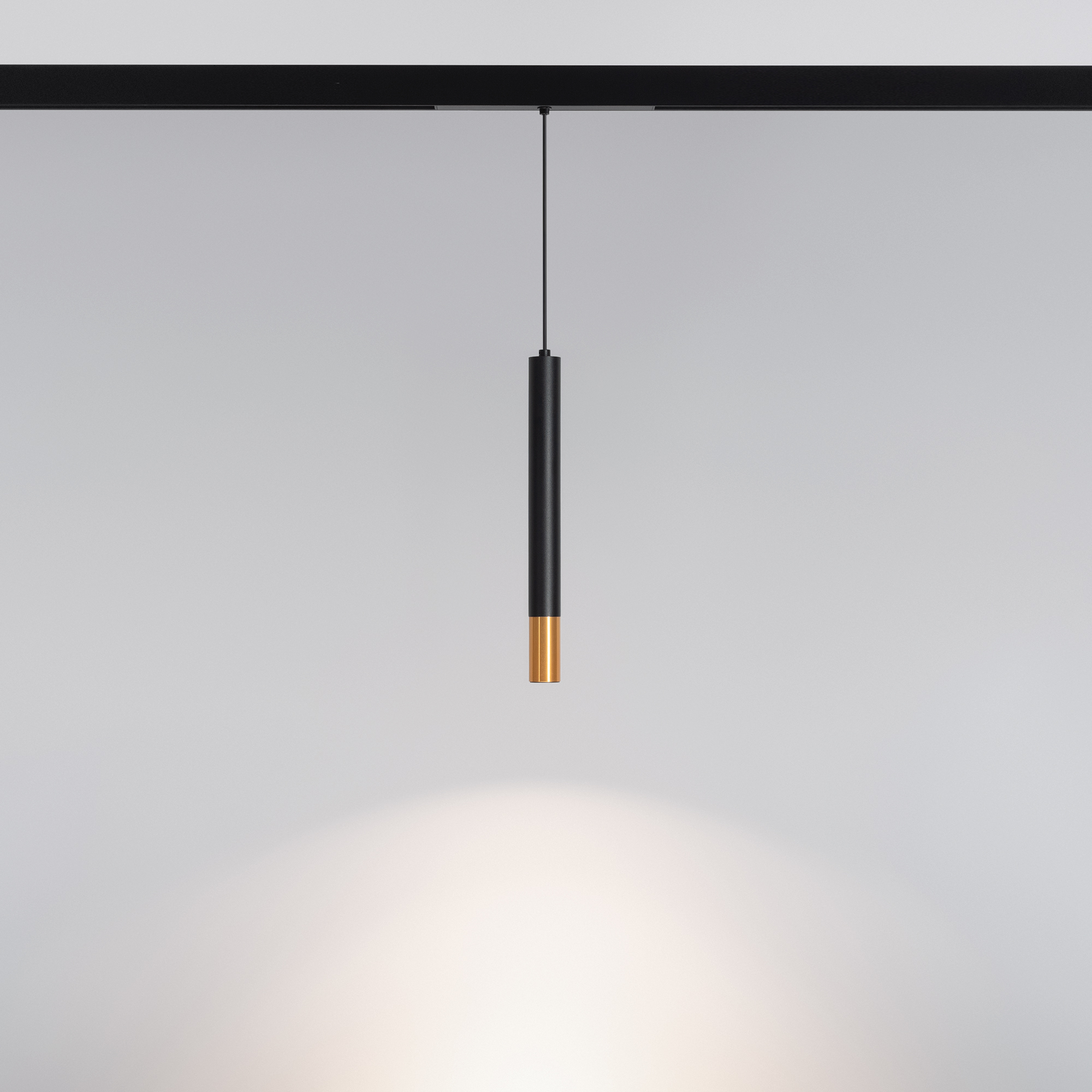 Светильник подвесной для магнитных треков шириной 25мм, 5Вт. Цвет свечения ДНЕВНОЙ 4000K, световой поток 300лм, угол 45°, CRI>90. Корпус цилиндрический, металл, цвет черный с золотой вставкой, IP20. Размер светового модуля 30*300 мм; размер установочного модуля 200*20*25мм; длина подвеса 1400 мм. Входное напряжение DC24V, мощность 5Вт. Драйвер DС24V/AC230V поставляется отдельно. Диммируется только с 026407, 027633. Подвес регулируется.