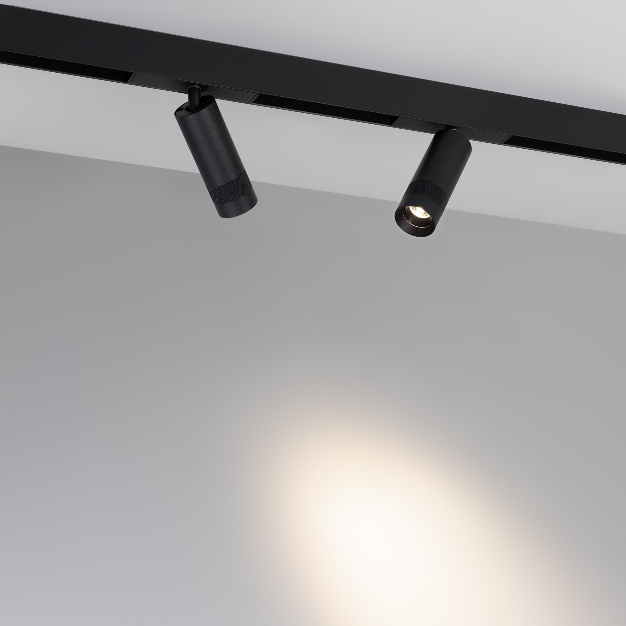 Светильник поворотный для магнитных треков шириной 25 мм, 7 Вт. Цвет свечения дневной 4000K, световой поток 410лм, изменяемый угол излучения 20-55°, CRI>90. Корпус цилиндрический, металл, цвет черный, IP20. Размеры LxWxH 128x35x105 мм. Входное напряжение DC24V, мощность 7 Вт. Драйвер DС24V/AC230V поставляется отдельно.