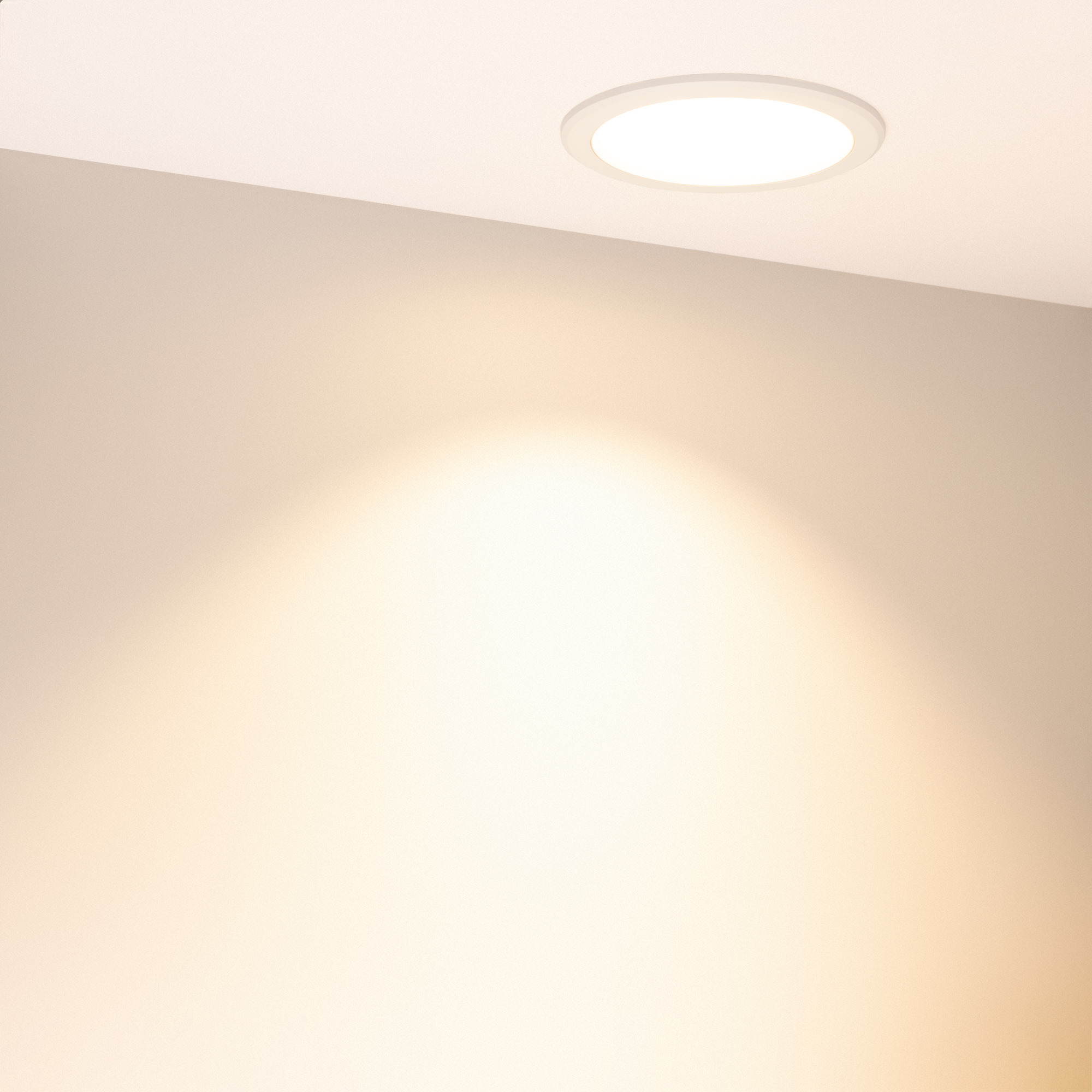 Встраиваемый светильник даунлайт с изменяемой мощностью и цветовой температурой. Мощность 9-12 Вт, св. поток 950-1310лм, 100 лм/Вт, цветовая температура 3000-4000-5700 K, CRI>90, угол 60°, напряжение питания 230 В. Белый круглый корпус, степень защиты IP54. Размер: диаметр 140 мм, высота 80 мм. Монтаж встраиваемый, установочное отверстие: диаметр 122-127 мм. TRIAC-драйвер, пульсация <1%.