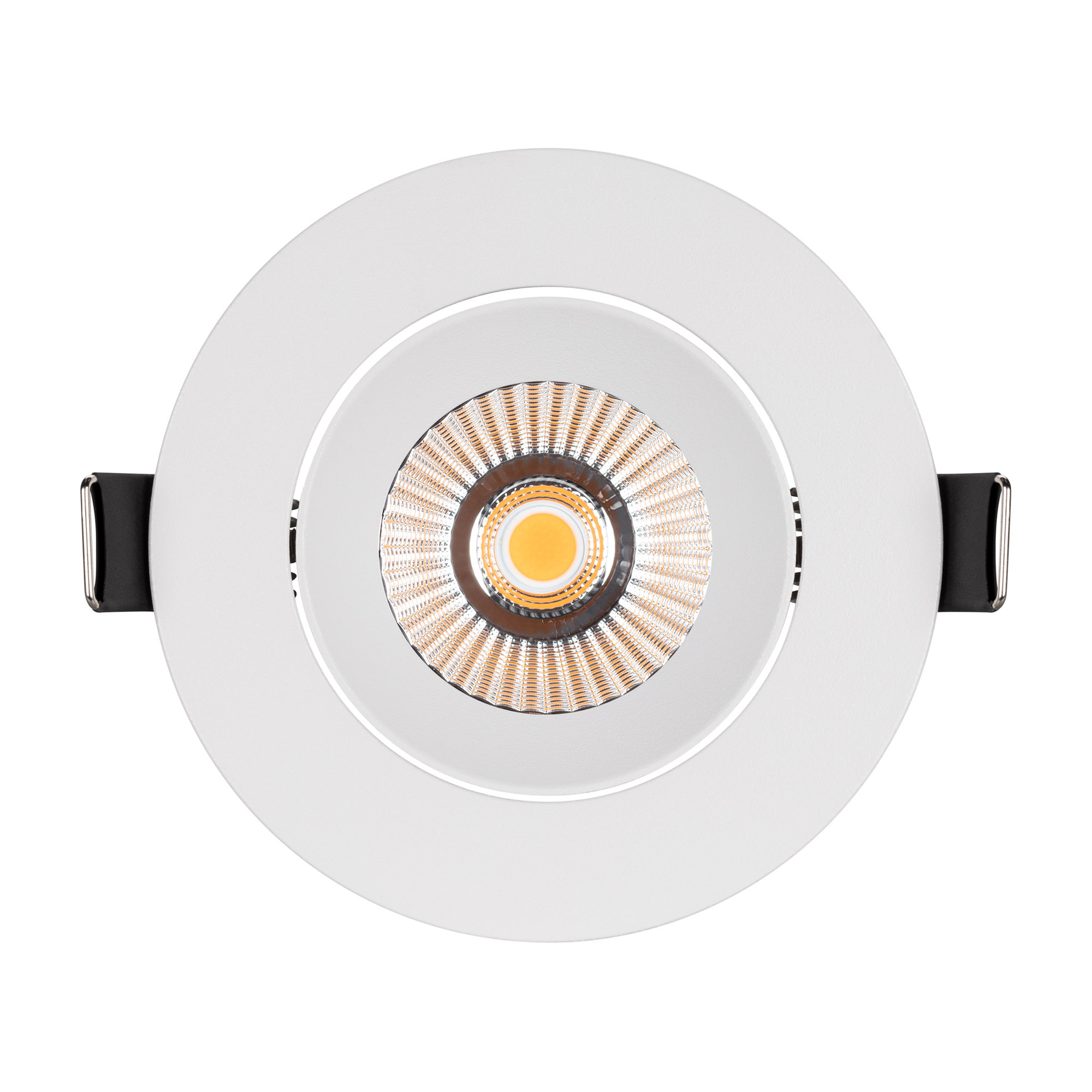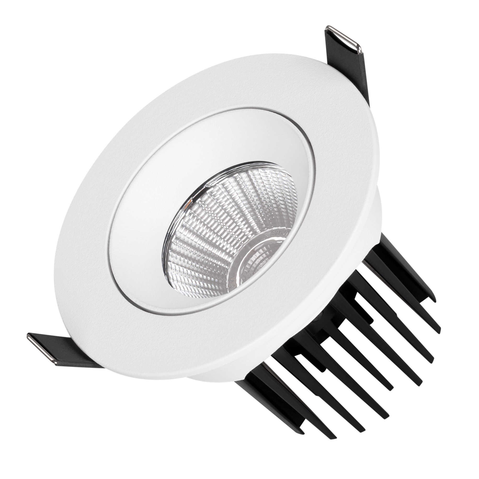 Встраиваемый поворотный светильник даунлайт. Мощность 10 Вт, св. поток 910 лм, 90 лм/Вт, дневной 4000 K, CRI>90, угол 36°, напряжение питания 230 В. Белый круглый корпус из алюминия, экран PMMA, степень защиты IP54. Размер: диаметр 94 мм, высота 75 мм. Монтаж встраиваемый, установочное отверстие: диаметр 77 мм. Драйвер IP54, 20-40 В, 250 мА, пульсация <1%.