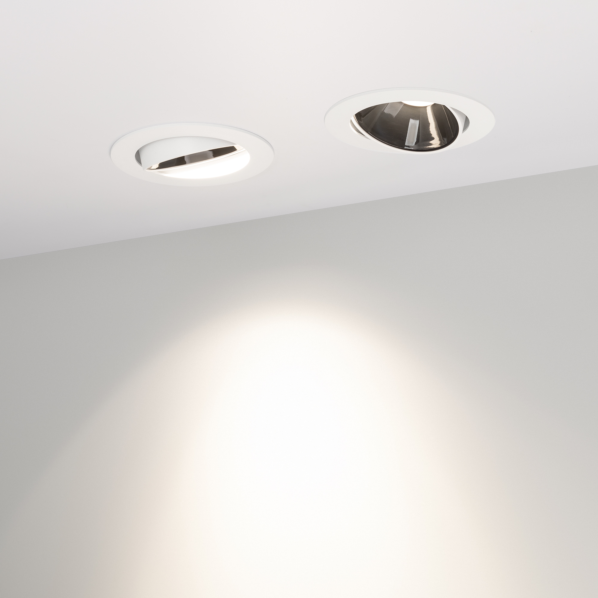 Встраиваемый поворотный светильник даунлайт. Мощность 12 Вт,св. поток 910 лм, 76 лм/Вт, дневной 4000 K, CRI>90, UGR<16, угол 32°, напряжение питания 230 В. Белый круглый корпус из алюминия, черный ГЛЯНЦЕВЫЙ отражатель из PMMA, степень защиты IP20. Размер: диаметр 102 мм, высота 70 мм. Монтаж встраиваемый, установочное отверстие: диаметр 95 мм. Драйвер 20-40 В, 300 мА, пульсация <2%.