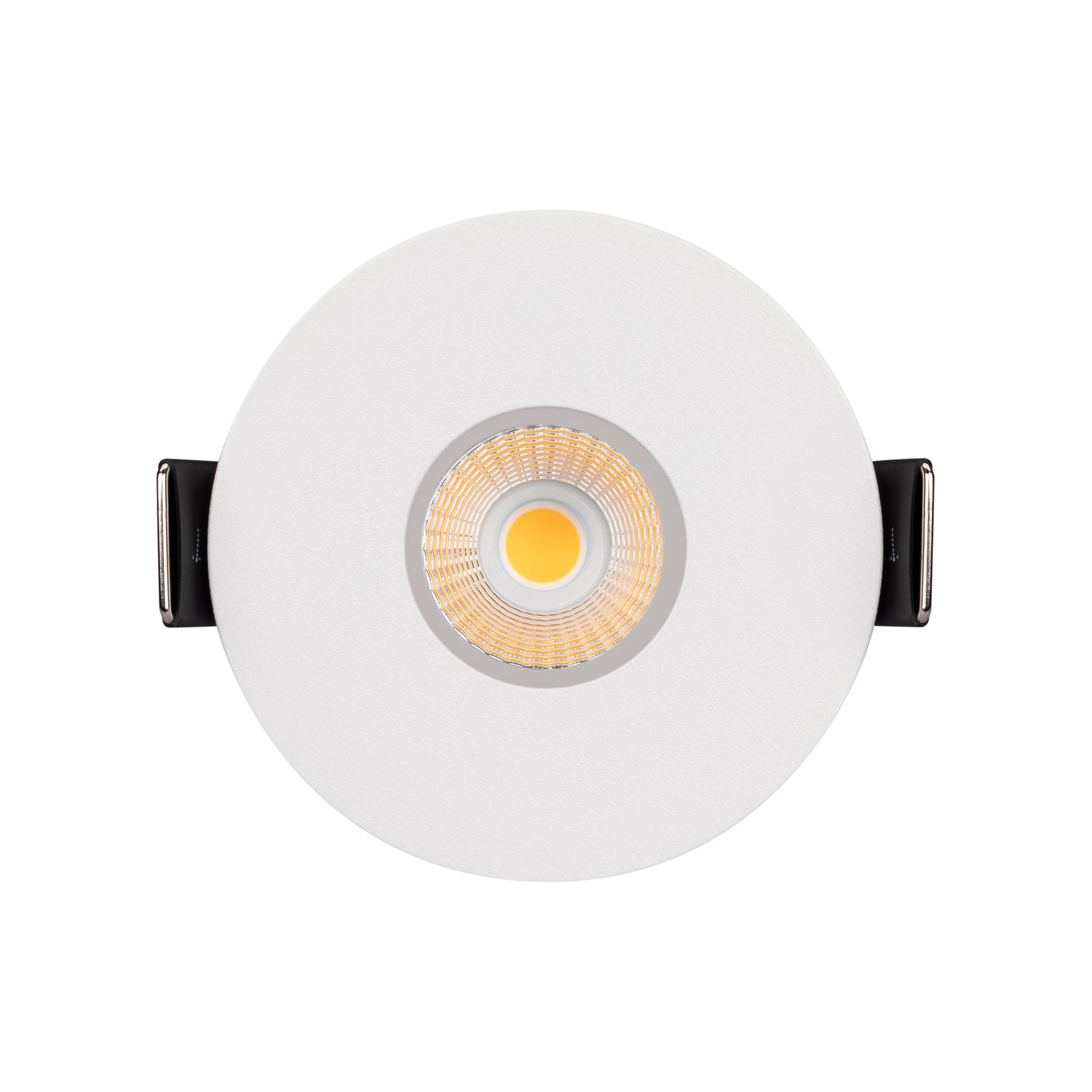 Встраиваемый светильник даунлайт. Мощность 5 Вт, св. поток 400 лм, 80 лм/Вт, теплый 3000 K, CRI>90, угол 60°, напряжение питания 230 В. Белый круглый корпус из алюминия, экран PMMA, степень защиты IP54. Размер: диаметр 54 мм, высота 30 мм. Монтаж встраиваемый, установочное отверстие: диаметр 45 мм. Драйвер IP54, 8-12 В, 400 мА, пульсация <2%.