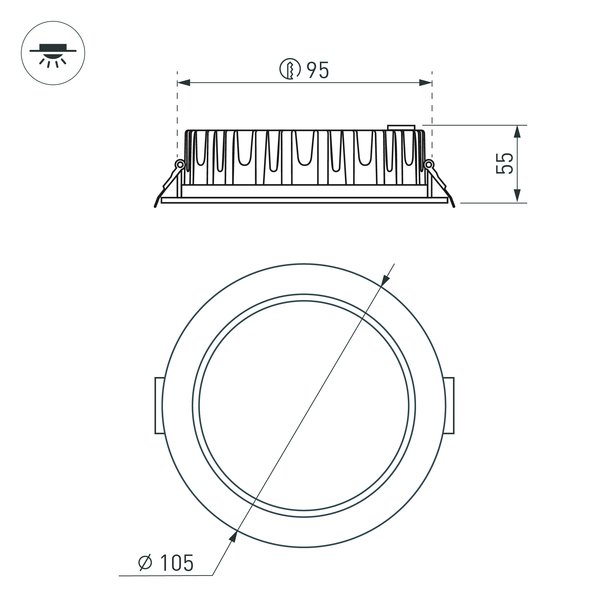 Встраиваемый светильник даунлайт. Мощность 9 Вт, св. поток 555 лм, 62 лм/Вт, тёплый 3000 K, CRI>90, угол 110°, напряжение питания 230 В. Белый круглый корпус из алюминия, экран PMMA, степень защиты IP54. Размер: диаметр 105 мм, высота 55 мм. Монтаж встраиваемый, установочное отверстие: диаметр 95 мм. Драйвер IP54, 30-45 В, 200 мА, пульсация <3%.