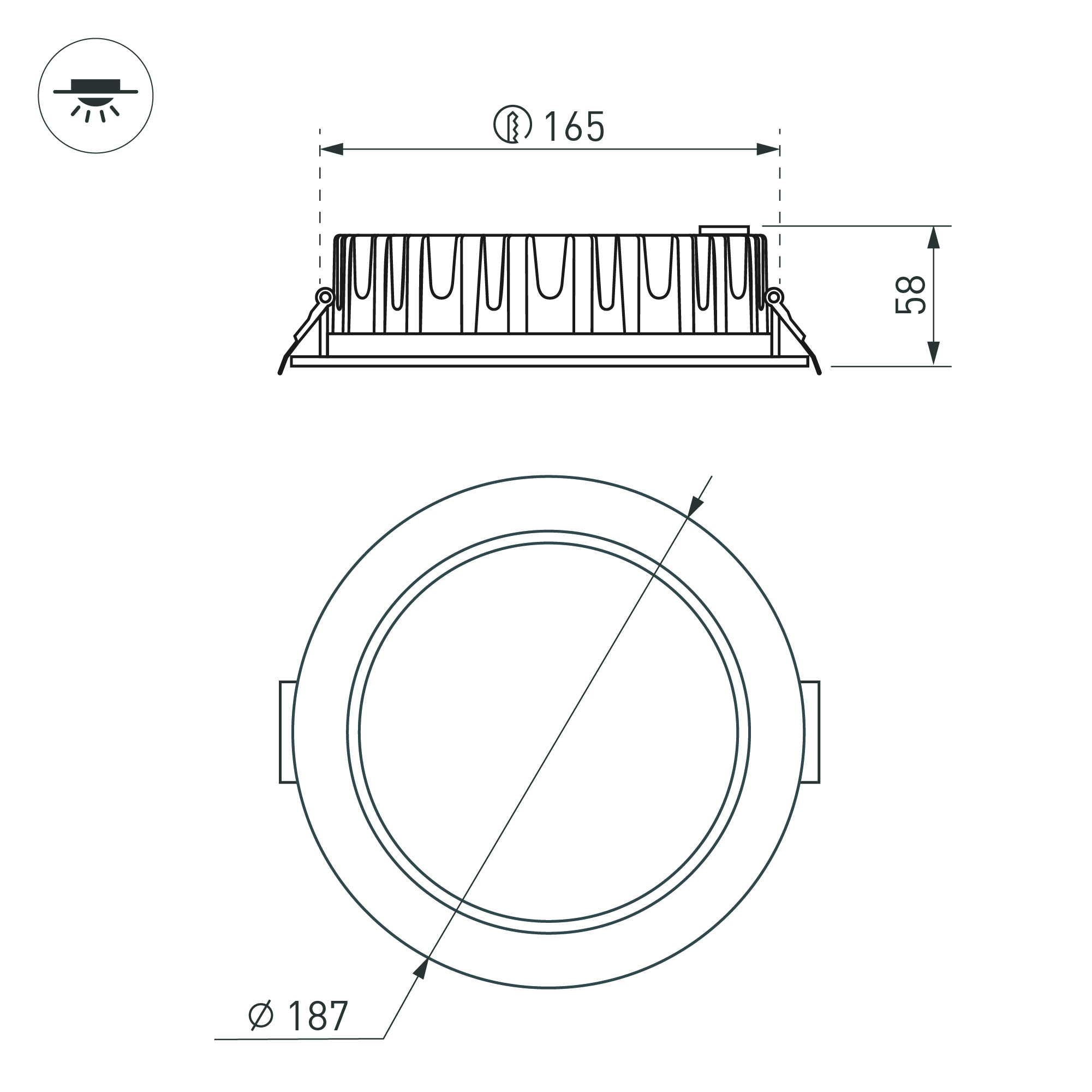 Встраиваемый светильник даунлайт. Мощность 21 Вт, св. поток 1440 лм, 69 лм/Вт, дневной 4000 K, CRI>90, угол 110°, напряжение питания 230 В. Белый круглый корпус из алюминия, экран PMMA, степень защиты IP54. Размер: диаметр 187 мм, высота 58 мм. Монтаж встраиваемый, установочное отверстие: диаметр 165 мм. Драйвер IP54, 27-42 В, 500 мА, пульсация <3%.